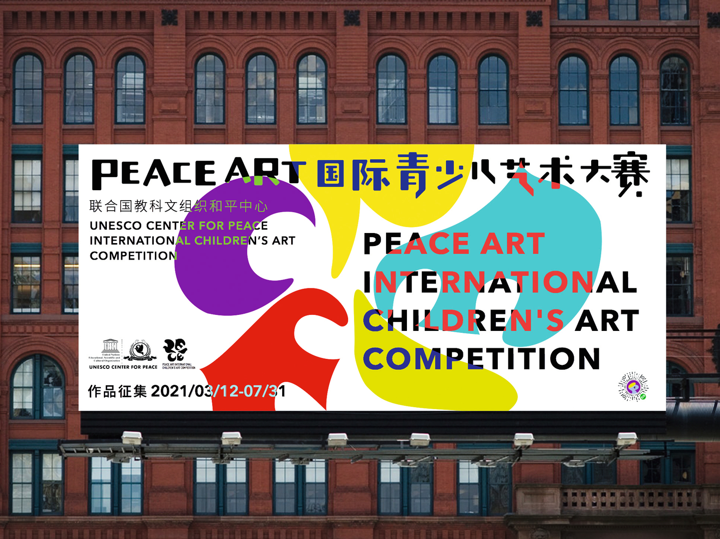 The Peace Art International Children’s Art Competition, authorised by the UNESCO CENTER FOR PEACE, aims to appeal to the young generation, conveying the idea of peace and building a platform for promoting friendship worldwide. Each letter in the graphic interpretation of the word “peace” evolves into the image of a dove of peace, each in a different shape. In the variable key visuals, these “dove letters” are combined into unique, colourful characters that represent diversity and a peaceful atmosphere. In this way, the child-oriented key visuals convey a world view full of hope and the joy of life.