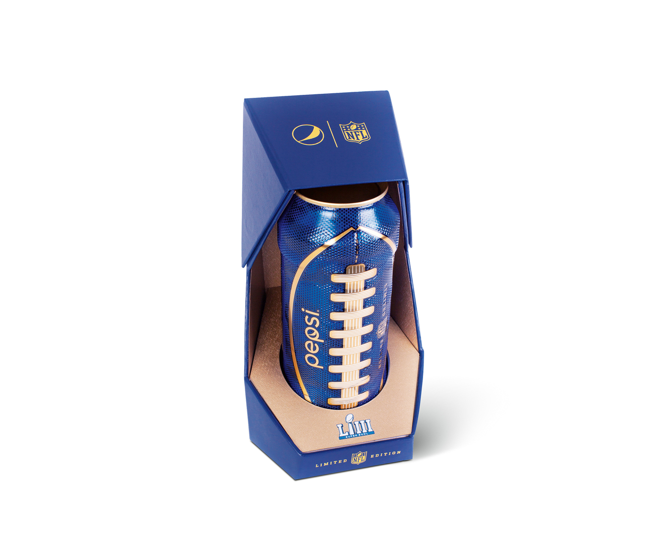 The “Pepsi NFL Laces Can” was created to celebrate sixteen years of partnership between Pepsi and the National Football League for Super Bowl LIII. Inspired by the form and feel of an American football, the aluminium can is textured and formed to mimic the laces on a football. This not only lends it a distinctive look, but also provides a special sensory experience. In order to achieve this, a particular technology to shape the cans and direct-to-shape printing (DTS) was employed in the production of this limited edition collector’s can.