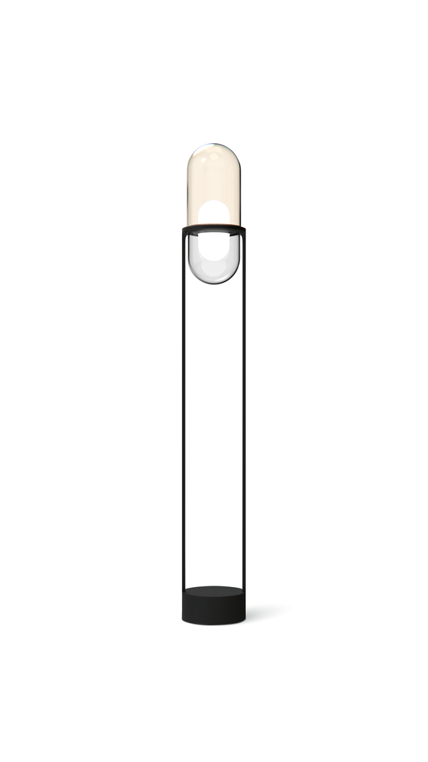 Diese Leuchtenserie wurde als blendfreies Up- und Downlight konzipiert, wobei kapselförmige Gläser für stimmungsvolle Lichteffekte sorgen. Skulptural schwebend wird die Hängeleuchte von filigranen Stangen getragen. Die Leuchtenkörper bestehen aus mundgeblasenem Kristallglas und setzen sich aus zwei farblich harmonisch aufeinander abgestimmten Teilen zusammen. Verbindendes Element ist ein horizontal platzierter Ring, aus dem die Glaskapseln entspringen und der gleichzeitig die LEDs trägt. Die Stehleuchten sind mit einem Standfuß aus Stein versehen.