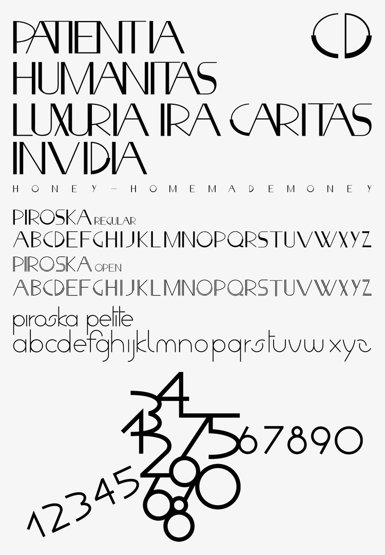 The Piroska typeface by Austrian artist Nikolaus Eberstaller is like a glance into the past when typefaces were still designed by hand and not on a computer. Thanks to their rectilinear design, the three variants, Piroska regular, open and petite, look genuine and authentic, while also featuring convincing characteristic details such as the small “s”, which is shaped by two abstract curves, distinguishing it clearly from conventional typefaces. Piroska is used on the Strehn wine label, but also in art and design projects of the artist such as Honey-Home Made Money and Geldwelt (money world).