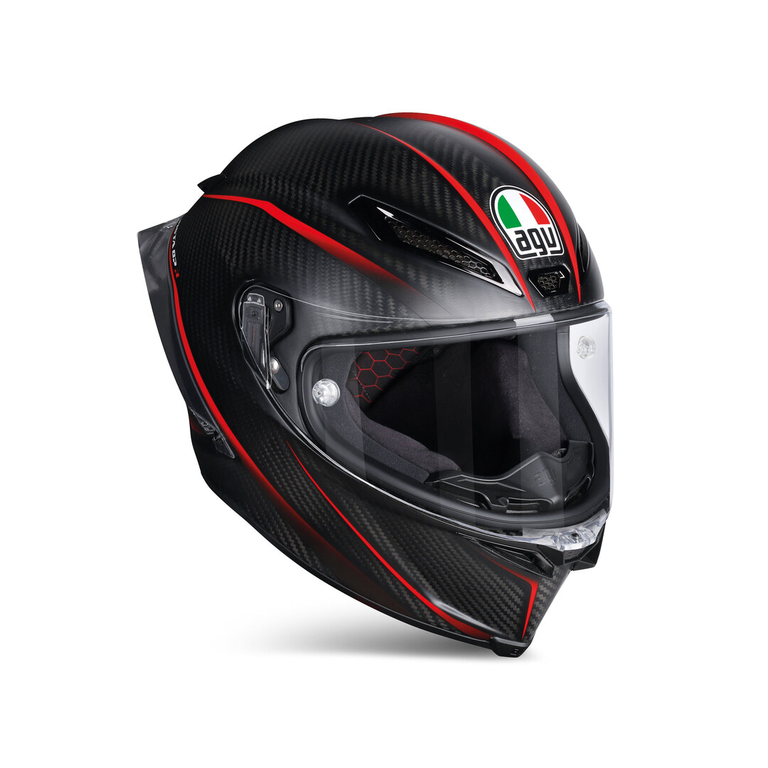 Der in Zusammenarbeit mit der MotoGP-Legende Valentino Rossi entworfene Motorradhelm Pista GP-R zeichnet sich durch ein hohes Maß an passiver wie aktiver Sicherheit, Komfort und Leistung aus. Seine Schale besteht zu 100 Prozent aus Carbon und ist mit einer 5-Dichte-EPS-Schale zu einer leichten Struktur geschichtet, die die Sicherheitsanforderungen weit übertrifft. Das 5 mm dicke New-Race-3-Visier verfügt über ein patentiertes Schließsystem für soliden Schutz sowie die Max-Pinlock-120Technologie für maximale Sicht bei jedem Wetter.