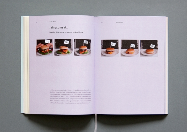 PlanBA was written for young design students in an attempt to answer many questions regarding the designer’s everyday life. The book offers a broad spectrum of contents and information – from choosing a university and educational system to insights into the job market and subsequent employment at an agency or working freelance, including hints on salary and charges – and is complemented by photographically staged statistics. Thus, the annual turnover that big German cities generate through the advertising, public relations and communication industries, for instance, is visualised as hamburgers: Düsseldorf holds top position and has grown to a size that is too large to eat, while Stuttgart, in last place, has to be satisfied with a dry hamburger roll. The guide does entirely without generic figures and instead presents each statistic or survey with suggestive illustrations. Important content in text and pictures is highlighted in white, while each chapter is clearly distinguished through a different pastel colour.