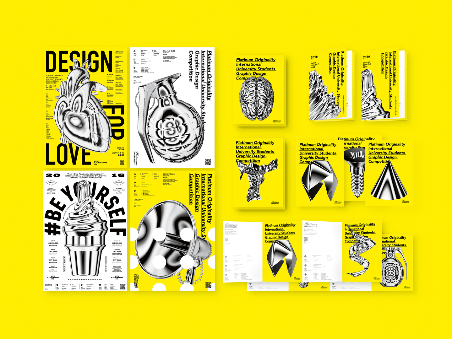 Platinum Originality is an international competition for graphic design students which is hosted by the China Academy of Art. The brand design for the 17th edition of the competition is dominated by the patterns of metal textures with a black and white gradient tone. The key visuals are designed through model building, with metal material used to express platinum texture and form patterns with rich details. This results in a visually uniform presentation of everyday objects with a three-dimensional appearance which set themselves apart from the bright-yellow background. The creative arrangement and combination of typography and graphics also encourages observers to use their imagination and associative skills and motivates them to get involved.