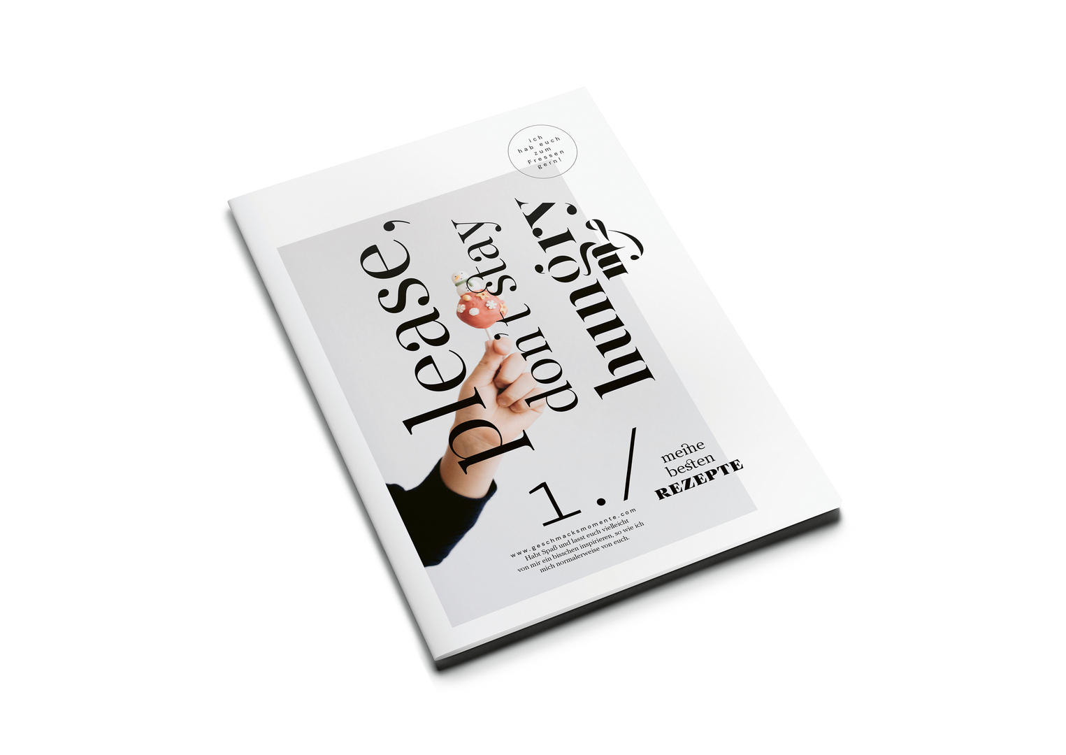 The first edition of this food blog magazine features the favourite recipes of Karin Stöttinger from her food blog “www.geschmacksmomente.com” in printed form. The playfully designed title “please, don’t stay hungry” is true to the personal way of speaking to the target group which characterises the blog. The creative recipes are presented with aesthetic photos and detailed text design. The layout serves to convey special taste experiences and the social pleasure which eating together brings. Photographed on white plates against a white background, the focus is on the visually appealing food.