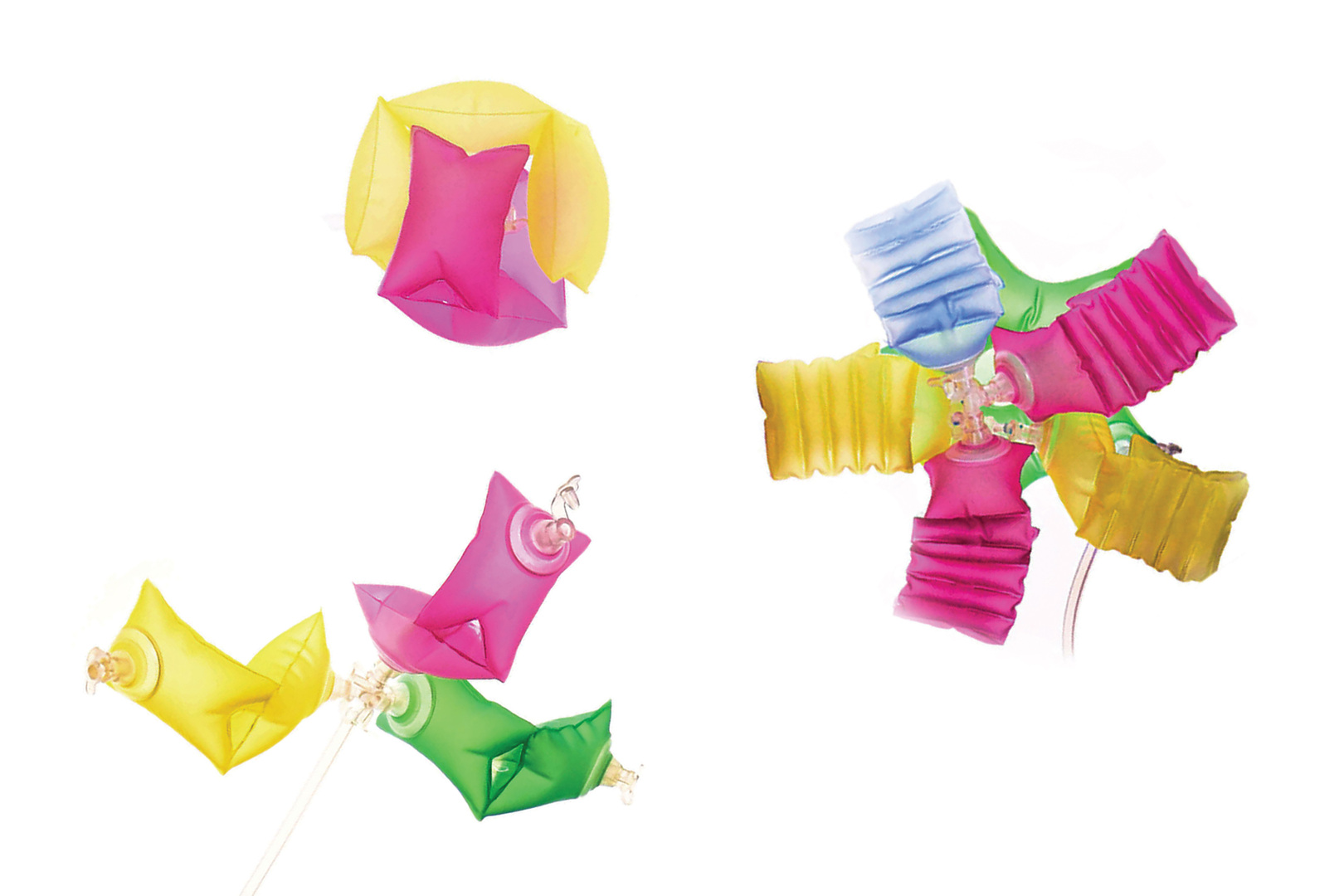 Seven PneuBots modules with varying actuation behaviours, such as shrinking, curling, and bending, were created. The various heat-sealed design patterns on the modular blocks constrain their deformation to produce a specific shape change under inflation. Each module can be connected to one or more identical or different modules, allowing a wide range of configurations, structures and applications to be explored. Each modular design features small, standardised units that can be independently combined in various configurations to create different forms and functions.