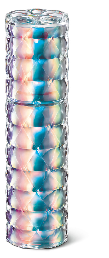 This flacon for a cosmetic serum from Japan aims to visualise the essential radiance of well-groomed skin. Thanks to precision grinding, the artful surface design of the bottle creates reflections and visual effects to give the impression of undulating light. The deep black box achieves a maximum contrast to the colourful, intensive sparkling effect of the bottle, for greater surprise when unpacking. This packaging design expresses the premium quality of the skin-care product with a creative sense of aesthetics.