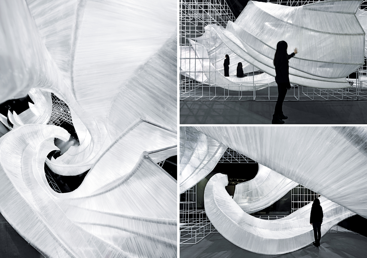 The attempt to rediscover the alternating potential of orderly construction led to the form of a huge “Transparent Shell” in this exhibition design. The construction is also the result of a search for an architecture that is able to further interact with and blend cities, environments, human beings and space. Visualising the process of creating and recreating, the whole device consists of 30 main bone models and three groups of large radian curves, realised through woven and criss-crossed layers. Visitors are invited to ponder the meaning of various “shell” functions, thus constructing a space with “flexible functions”.