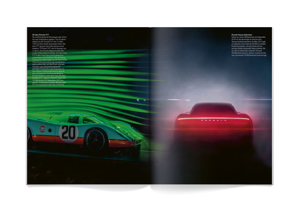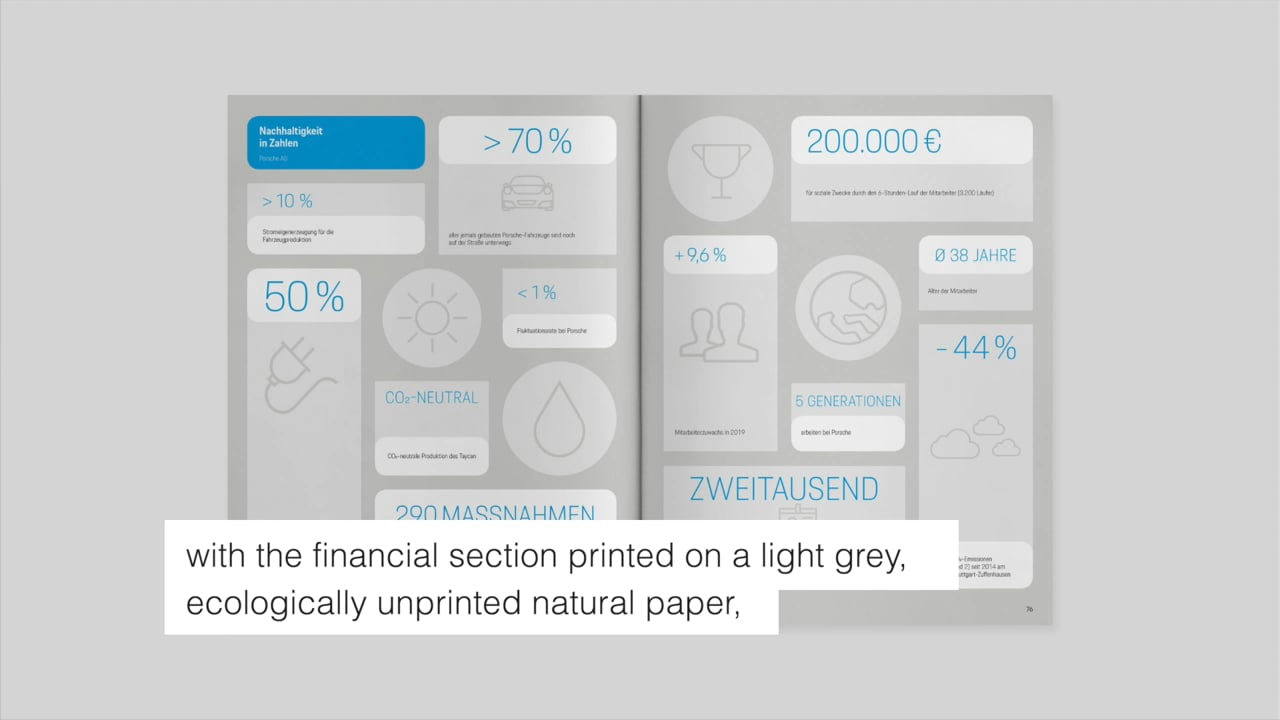 Sustainability is a central pillar of Porsche’s corporate strategy and implemented comprehensively at the economic, ecological and social levels, as documented in the annual and sustainability report entitled “Pioneering Spirit”. A large number of information graphics, illustrating measures and results with regard to sustainable corporate management, contribute to the publication’s clear presentation. The topics are complemented by exciting photo series that visualise the claim of this premium-quality car manufacturer. A special shade of blue was used as a design element, based on the launch campaign for the Taycan electric sports car, whereas the materials were consistently selected with sustainability in mind. Thus, all papers are fully recyclable, with the financial section being printed on a pale grey, ecological uncoated paper, which is made from 100 per cent waste paper, while the content section is produced in a climate-neutral way and is FSC-certified. Moreover, to avoid microplastics, Porsche also relied entirely on deinkable printing inks.