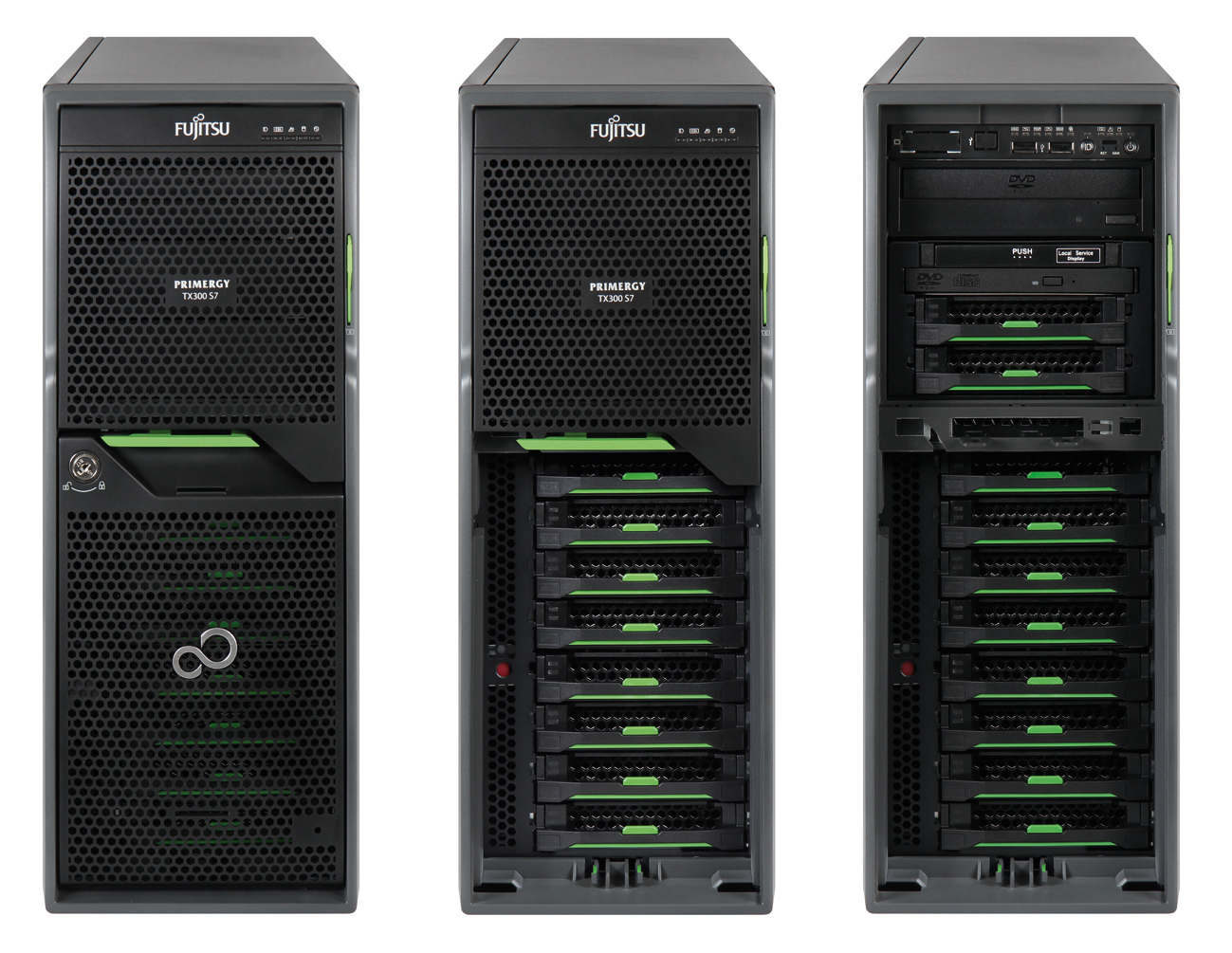 Die Tower-Server Primergy TX 150/200/300 sind kompromisslos auf Leistung, Erweiterbarkeit und Verfügbarkeit ausgerichtet. Ihre Ausbaufähigkeit ist hoch: Zehn Erweiterungs-Slots, bis zu 24 Festplatten, diverse LAN-Karten, redundante Lüfter und bis zu vier Hot-plug-Netzteile finden in den Allround-Servern Platz. Sie erreichen einen Wirkungsgrad von 94 Prozent und reduzieren dadurch Betriebskosten und Umweltbelastung.
