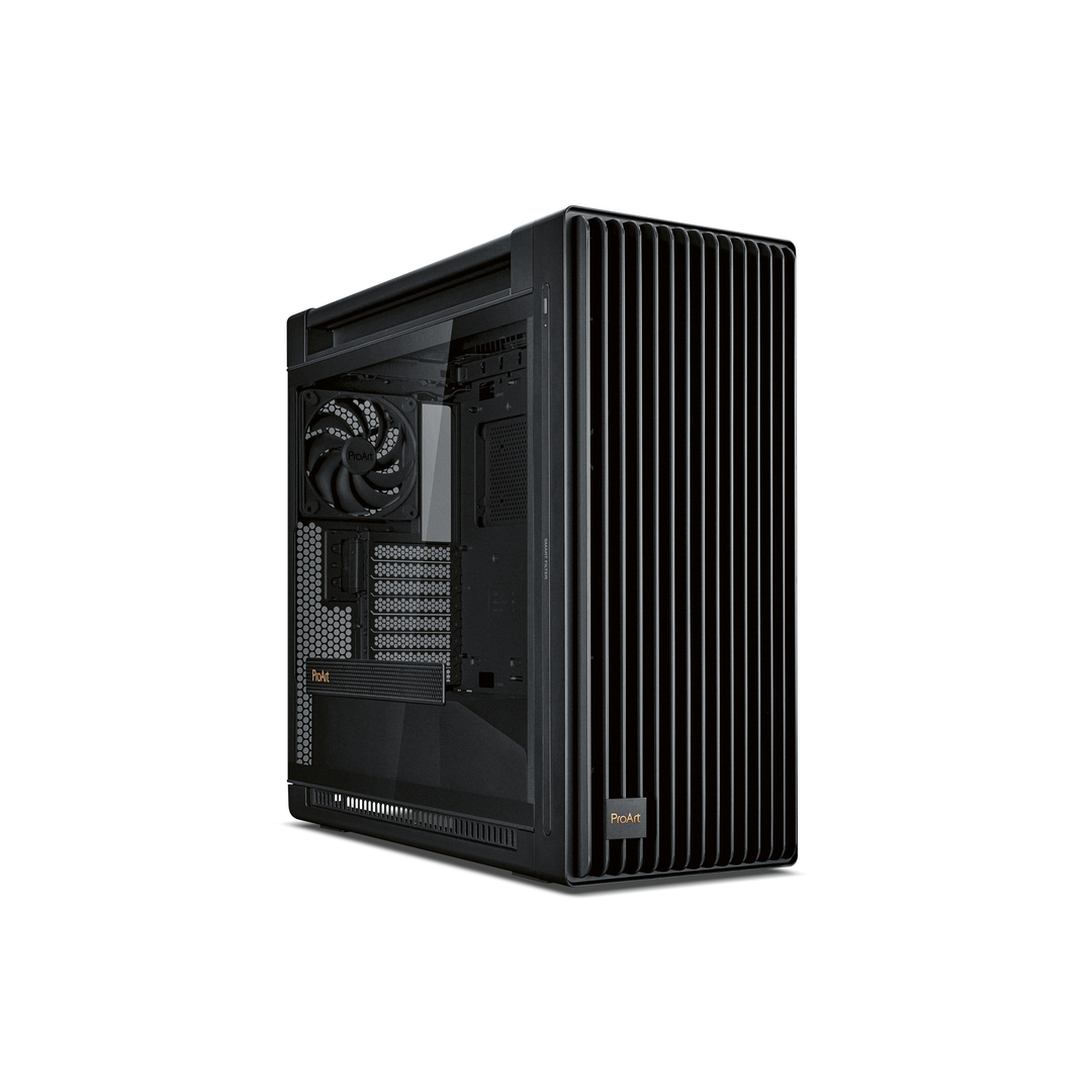 ProArt PA602 ist ein Computergehäuse, dessen Gestaltung auf eine optimale Luftzirkulation und Kühlung ausgerichtet ist. Seine Vorderseite verfügt über ein 15,5-mm-Gitter mit hervorstehenden Rillen für eine maximale Belüftung. Zwei Frontlüfter und ein Hecklüfter sind vorinstalliert. Deflektoren leiten die Luft gezielt und verbessern so die Kühleffizienz. Ein Staubsensor erinnert den Nutzer an eine rechtzeitige Reinigung. Das Gerät bietet ausreichend Platz zur Montage der Hardware; ein werkzeugloser Einbau der Grafikkarte ist möglich.