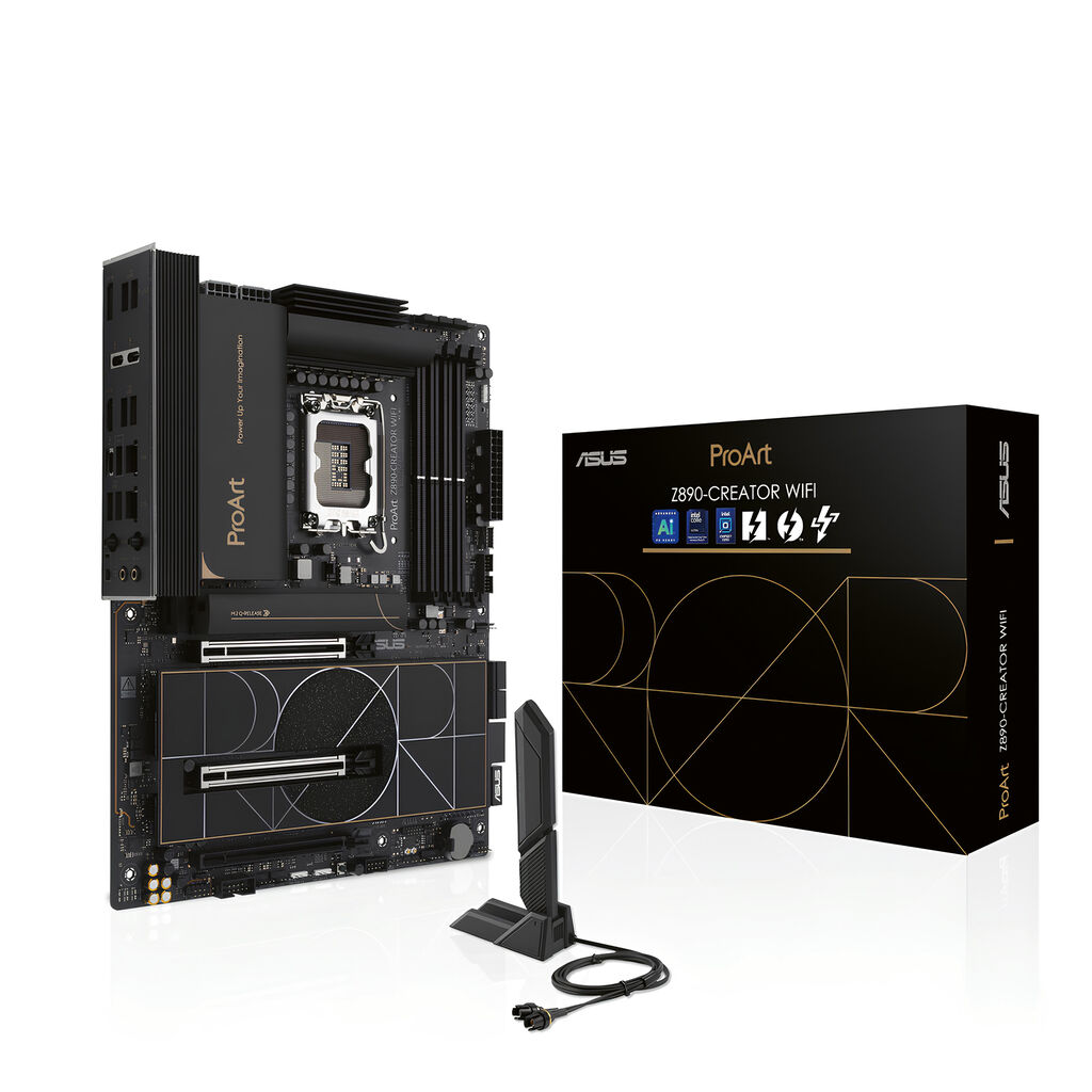 Die klar strukturierte Oberfläche in Anthrazit mit goldenen Akzenten unterstreicht den professionellen Anspruch des Motherboards ProArt Z890-Creator WiFi.
