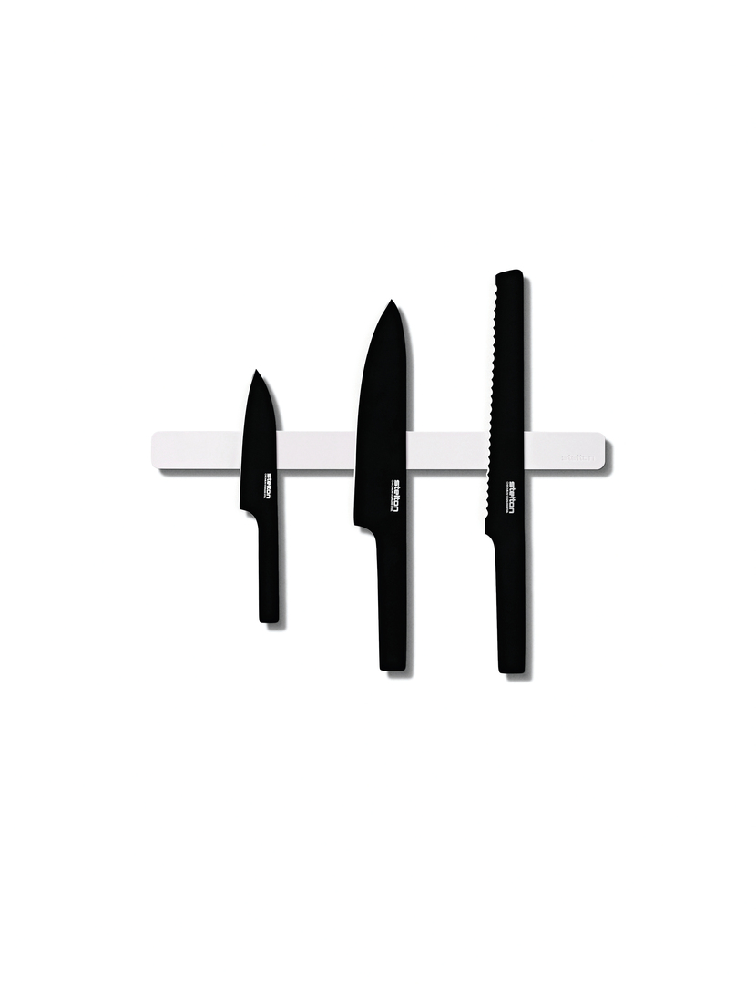 Wie die Klaviatur eines Pianos reiht sich die Messerserie „Pure Black“ auf der Magnet- leiste „Pure White“. Übergangslos fließen Griff und Klinge der Edelstahlmesser zu einer einzigen, ausgewogenen Form. Stelton gelingt damit nicht nur ein stilvoller Blickfang für die Küche, auch die Qualität des Materials und der Handhabung wissen zu überzeugen. Die Oberflächenveredelung sorgt für eine ausgezeichnete Handhabung sowie eine hygienische und leichte Reinigung.