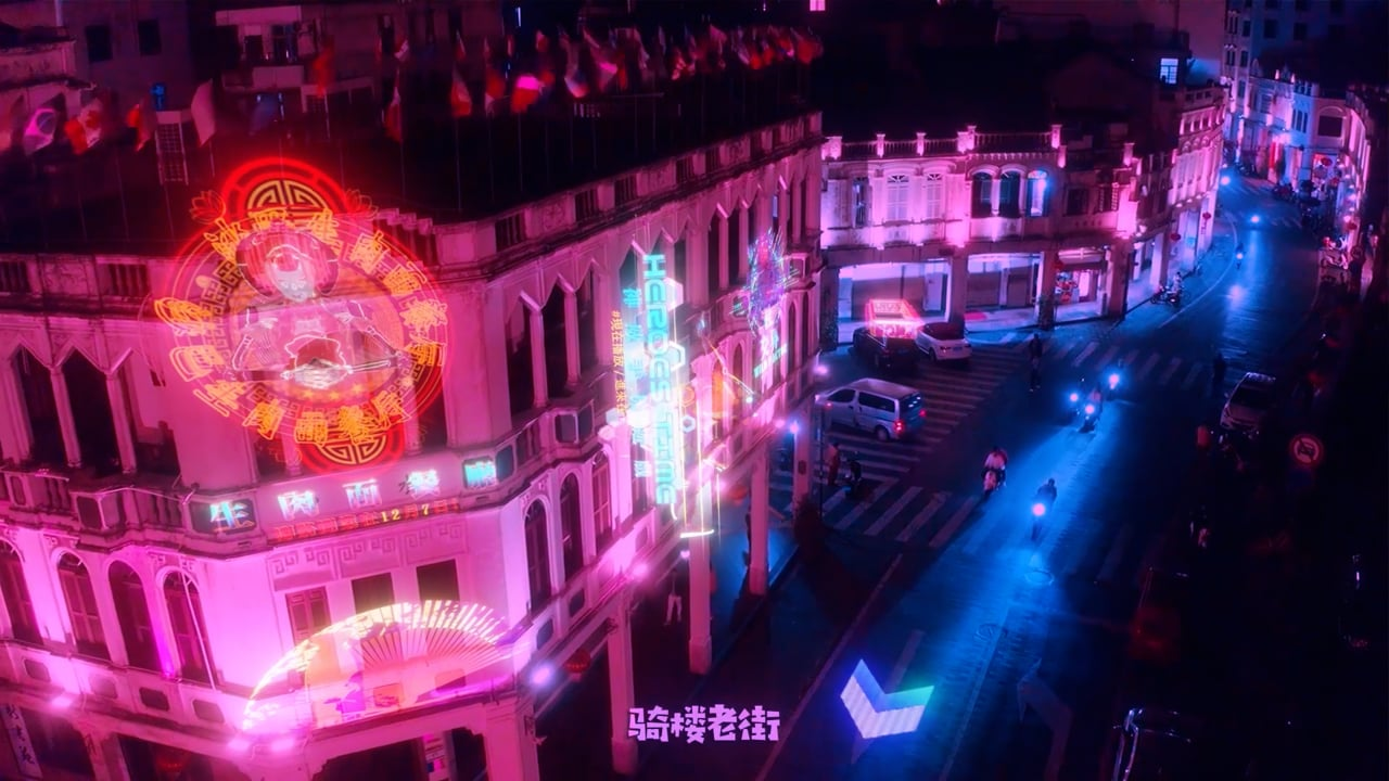 The Qilou Old Street in Haikou, China, is characterised by both traditional Eastern as well as modern Western architectural styles. The film “Qi Lou” takes this contrast and develops it further by drawing up a fictionalised future in the trendy cyberpunk style. It does this by superimposing futuristic-looking technology onto the historic original locations. Floating holograms and screens bathe the night-time streets in neon-coloured light. The illusion is seamless and both fascinating and shocking in equal measure – the intention is to create greater awareness of the district’s unique cultural heritage.