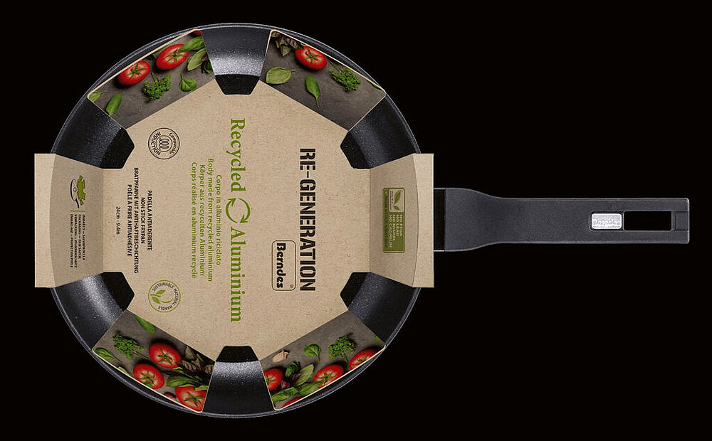Zu 100 Prozent recyceltes Aluminium ist der Hauptbestandteil der Kochgeschirrserie Re-generation von Berndes. „Recyceltes Aluminium braucht bei der Herstellung bis zu 95 Prozent weniger Energie und 92 Prozent weniger Treibhausgasemissionen als neues Material – bei gleichem Qualitätsniveau“, hob die Jury den Nachhaltigkeitsaspekt der Serie hervor. Die Griffe bestehen aus einer innovativen Kombination von wiederverwendetem Bakelit und Holzmaterial aus nachhaltiger Forstwirtschaft mit PEFC-Siegel. Die hochwertige Gestaltung mit eingegossenem Berndes-Logo aus Edelstahl sorgt für eine exklusive Optik und Haptik.