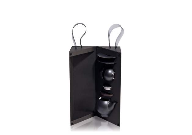 In accordance with a “reflecting the moon” design approach, this Taiwanese tea set gift box includes a moon-like teapot as well as two teacups with saucers. A broad, handmade paper band with a high-quality graphic print, showing a paper cutting of the teapot, is wrapped around the slim, tall cardboard box. Two sheer, textile loops serve as handles and symbolise the slowly rising scent of the tea. Inside the box, the tea set is safely stored in slide-in compartments.