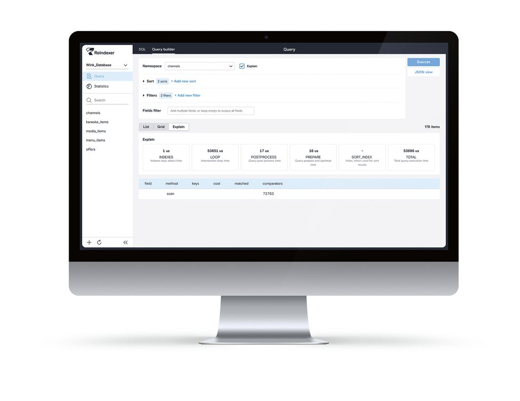 Reindexer is an embeddable, in-memory, document-oriented database. The main objective is database management with fast search functions for complex and extensive queries. The user interface is clearly structured and offers the possibility to efficiently configure database settings such as profiling, namespaces and replication. The design incorporates a reduced colour palette and discreetly highlighted interactive areas to support users in concentrating on the essentials.