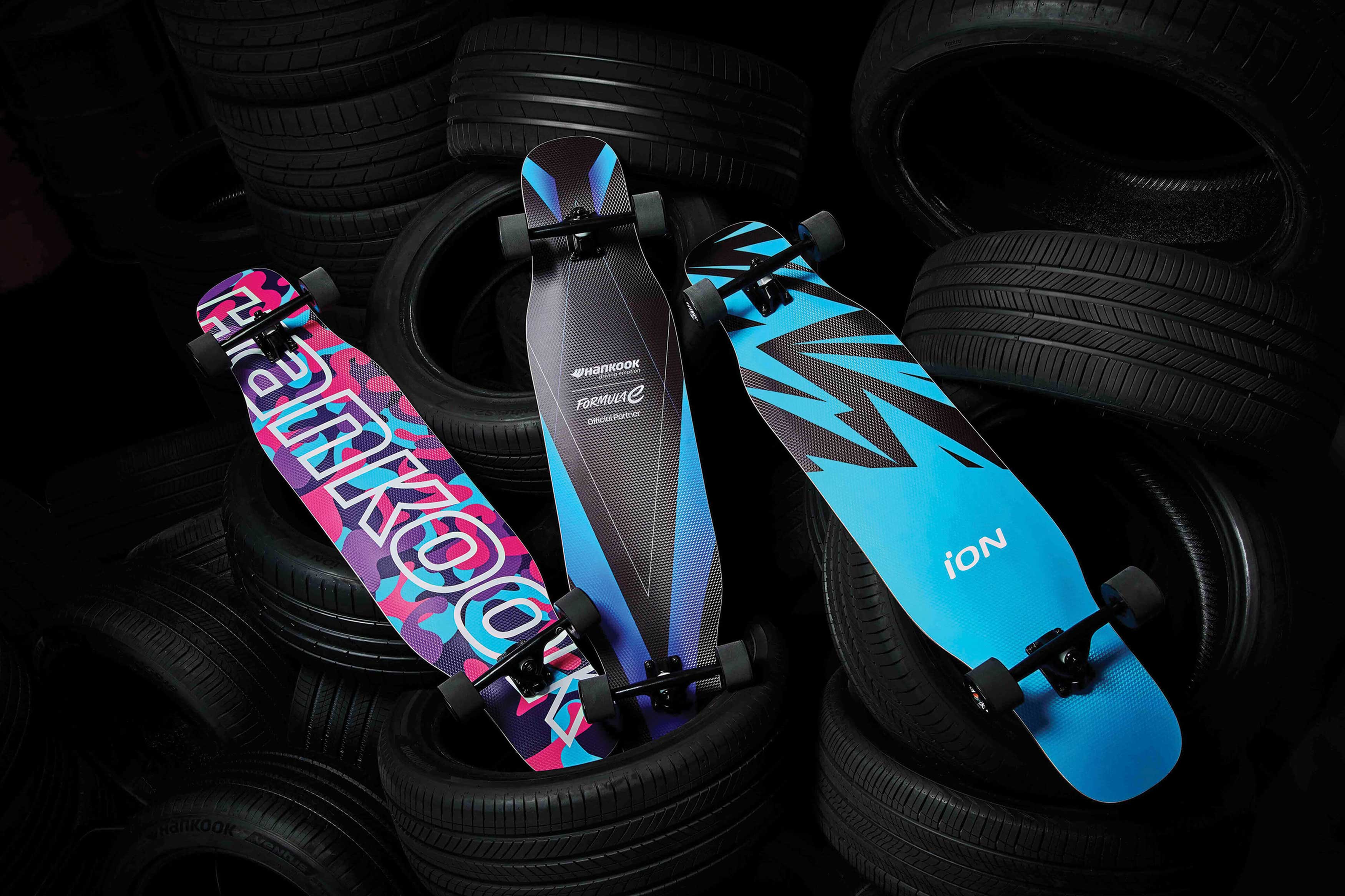 This longboard showcases three distinct graphics representing Formula E, iON, and Hankook. Its eco-friendly wood upper plate, featuring tyre tread grip tape, embodies Hankook’s identity. The core utilises recycled rubber for superior shock absorption. In collaboration with Checkerspot, the wheels are crafted from 10% algae oil bio-polyurethane. Designed for performance and produced by domestic artisans, it boasts a longer kick and wheelbase. Red Dot Award: Design Concept | Concept | Sustainability