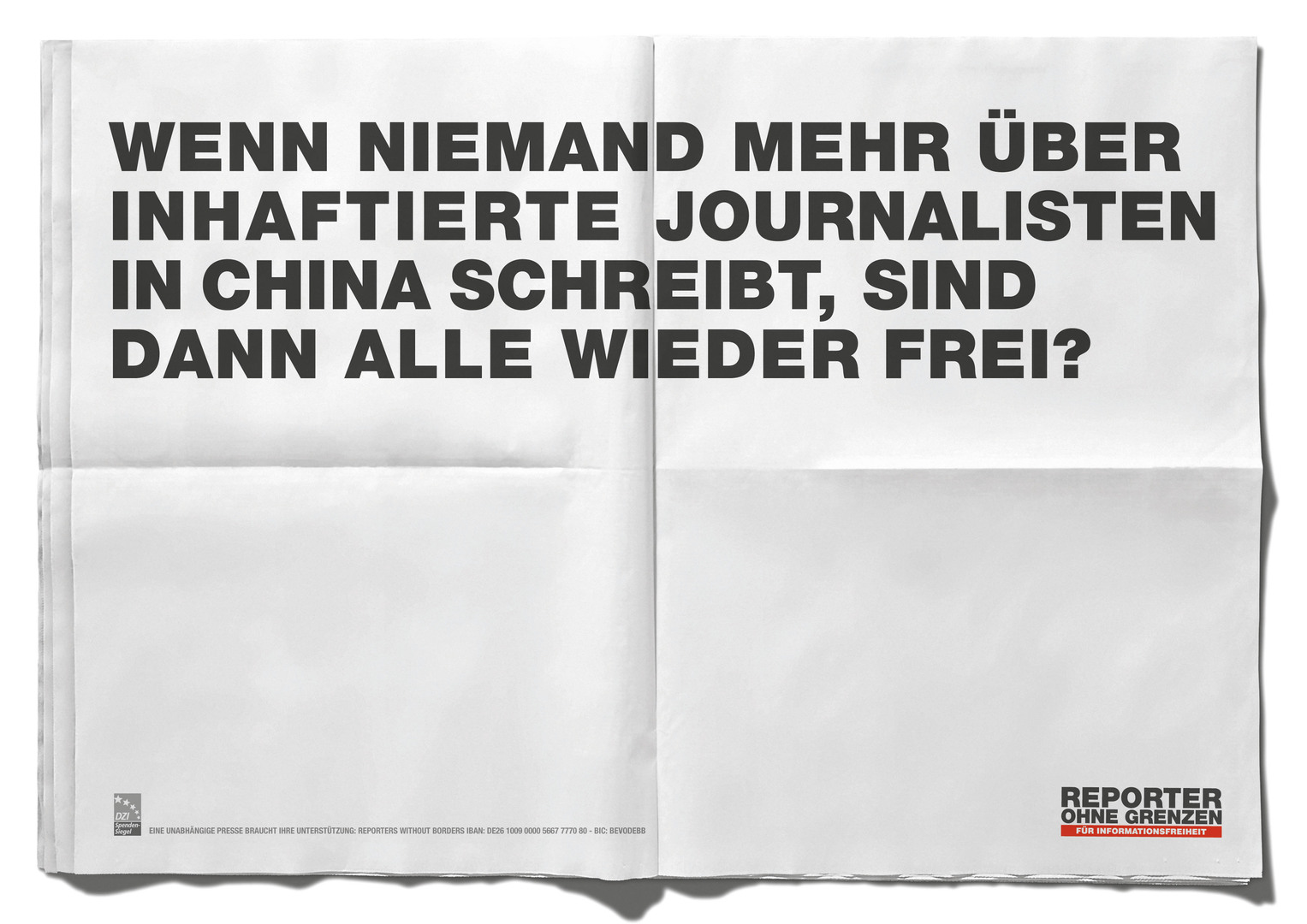 Aiming to raise awareness of the fact that in many countries people are controlled and manipulated by the censorship of public media, this broadbased campaign raises some provocative questions. It illustrates the importance of free reporting by asking: “For if the truth remains unknown, does that mean it is less true or that the problem has already been solved?” The commissioning client Reporters Without Borders e. V. has been campaigning for 20 years against this abuse of the media and fighting to bring the truth to light. The campaign sought support from like-minded people, including in the form of donations.