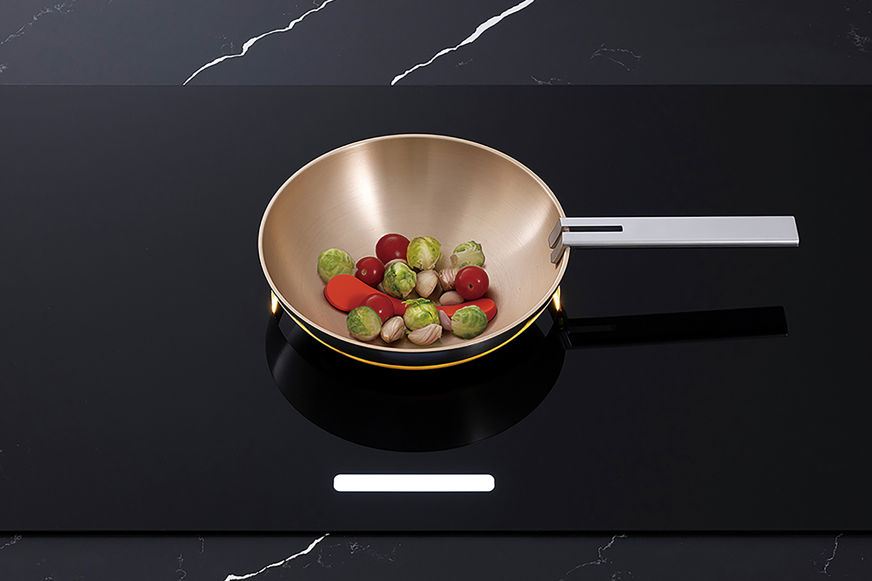 ROBO-CHEF COOKTOP uses induction technology and specialised accessories with an automatic stirring function. It features a spherical indentation for container placement and blade rotation with customisable blades for various recipes. A central ‘Robo-Chef’ zone with five additional burners facilitates multi-cooking, and the front display shows settings and progress. Its intelligent automation ensures perfect results without extra devices, enhancing usability and reducing clean-up.