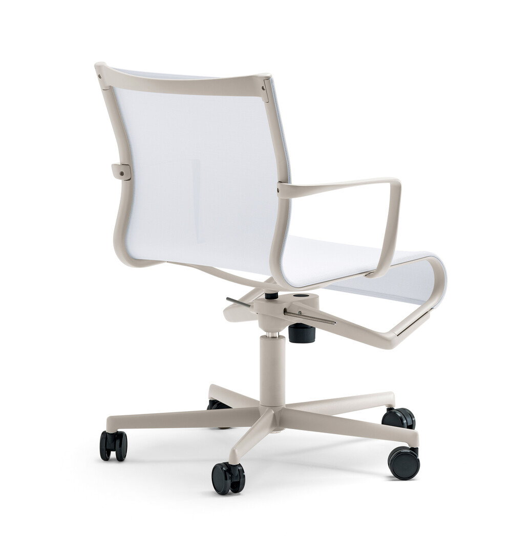 Rückenlehne und Sitzfläche des Bürostuhls rollingframe 52 bestehen aus fließgepresstem Aluminium und formen seine harmonische Struktur. Auch die Armlehnen sind fein geschwungen und unterstreichen die Leichtigkeit der Konstruktion. Die Sitzfläche des höhenverstellbaren Stuhls wurde im Rahmen der Entwicklung um zehn Prozent vergrößert und bietet so einen optimierten Sitzkomfort. Stabilität verleiht der Fünfsternfuß mit Rollen. Die Bezüge sind aus Polyesternetzgewebe und wahlweise in Stoff oder Leder erhältlich.