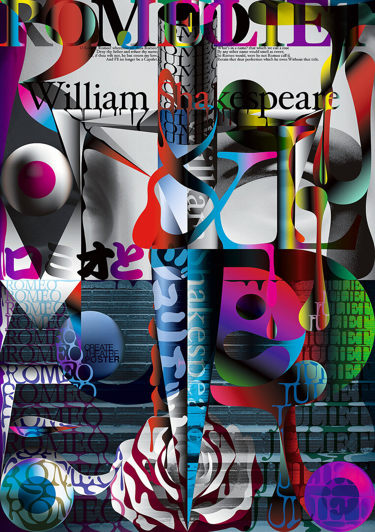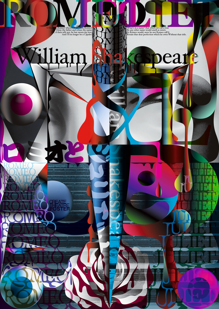 This series of posters presents a contemporary approach to communicating the works of William Shakespeare. With expressive colours and forms, the posters highlight the powerful emotions which Shakespeare’s plays are still able to evoke. The poster for “Romeo and Juliet” uses a rose with a dagger at its centre to express the power and fragility of love. Particular emphasis has been placed on the use of Latin and Japanese characters.