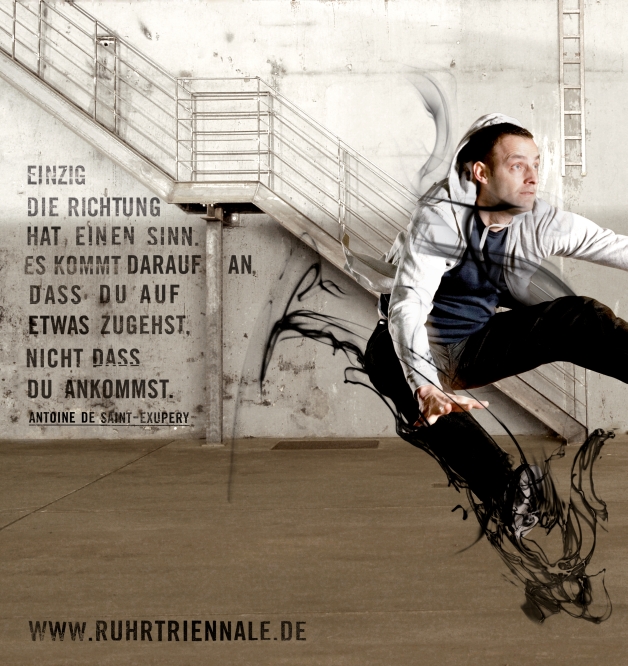 For the second season of the Ruhrtriennale cultural festival, with the theme of “migration”, photographs depicting the venues with people in vivid motion were used for the illuminated, large billboard and in-house poster series. Continuing the key visual of the last season, the human handwriting, streaks in space symbolise sequences of movement and represent the interaction between human beings and buildings, physicality and spirituality. The colours used for the posters are reserved and subtle, the paintbrush logo functions as a hybrid of the number “3”, standing for “Triennale”, and an “R”, standing for “Ruhr”.