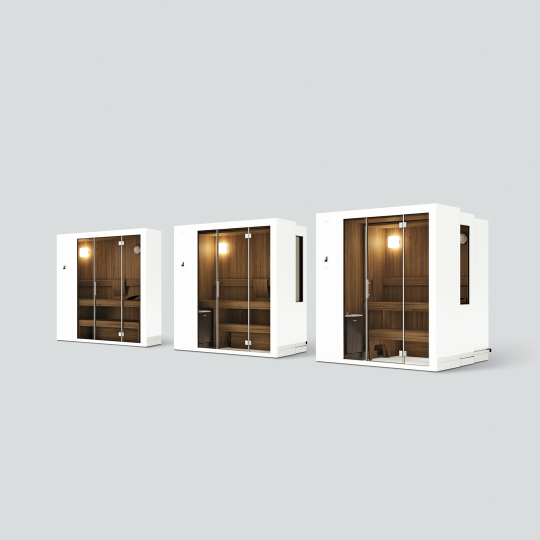 Diese Sauna entfaltet sich auf Knopfdruck. In unbenutztem Zustand steht sie mit einer Tiefe von etwa 60 cm an der Wand. Durch Bedienung der flachen Steuerung an der Front fächert sie sich zu einer annähernd dreimal so tiefen funktionsbereiten Sauna auf. Die drei ausfahrbaren Elemente stoppen automatisch, sobald sich ihnen etwas in den Weg stellt. Beim Öffnen gleitet der integrierte Ofen aus einem Gehäuse heraus. Die Sitz- und Liegeflächen sind standardmäßig aus Hemlocktanne gefertigt, werden aber auch in Nuss oder Zirbelkiefer angeboten.