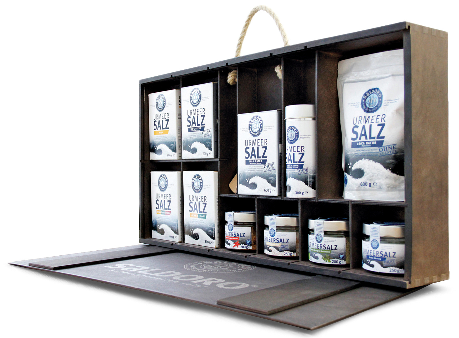 The focus of this packaging design, developed for a new salt product distributed in Germany, is on the origin of the product. It tells the story of the 250-million-year-old rock salt deposited by the primordial seas that once covered the entire European continent. This zero-emission rock salt is mined hundreds of metres underneath the plains of Northern Germany. The name SALDORO is a combination of SAL (salt) and ORO (gold) and is reminiscent of the importance of the “white gold” and the Hanseatic League. The logo shows a cog, a Hansa ship that transported salt in medieval times. A colour palette ranging from salt white and deep sea blue to slate grey conveys original purity. Moreover, the premium packaging is refined by a glossy silver hue.