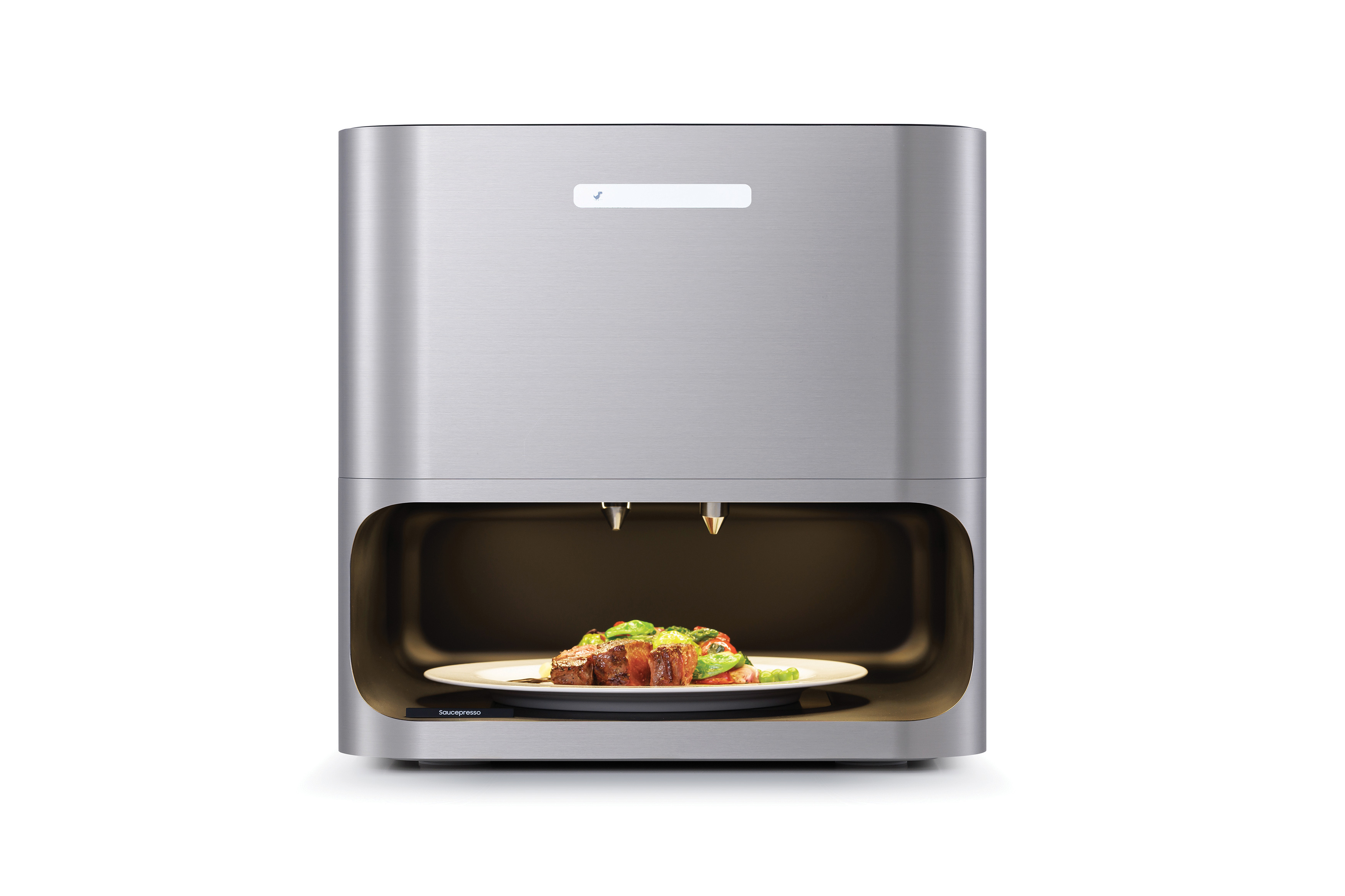 Saucepresso’s sleek rectangular form fits seamlessly into any kitchen space. It features a front display window, dual sauce nozzles, and a tray for bowls. The top cap and rear cover facilitate easy maintenance. With 17 seasoning formulations and a water purifier, it delivers custom culinary experiences. Multi-use containers and a rail system enhance sustainability, offering a personalised cooking solution for diverse tastes.