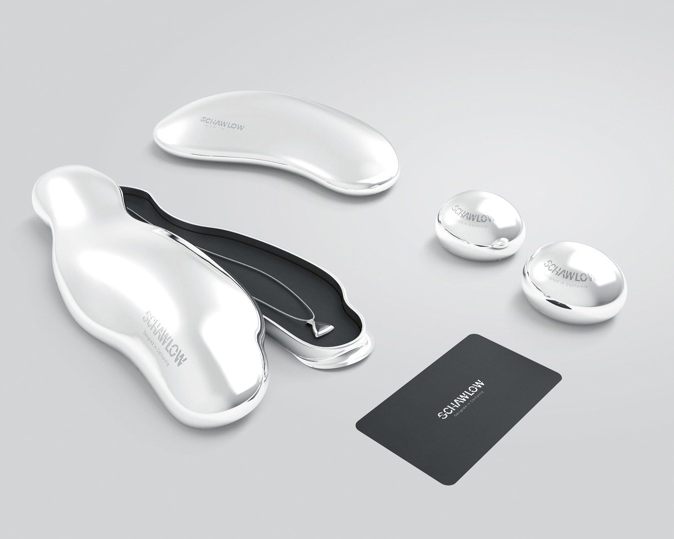 A Chinese proverb attributed to the legendary philosopher Laozi stresses the importance of water as our most valuable asset. In the saying, a person with a noble character is compared to water, because water sustains all beings and does not compete with them. Inspired by the Eastern wisdom, this packaging design picks up on characteristics of water to stage a jewellery collection. The metal shells protecting necklaces or bracelets attract attention through their shimmering surface and organic shape. Inside, a black lining effectively sets off the silver objects.