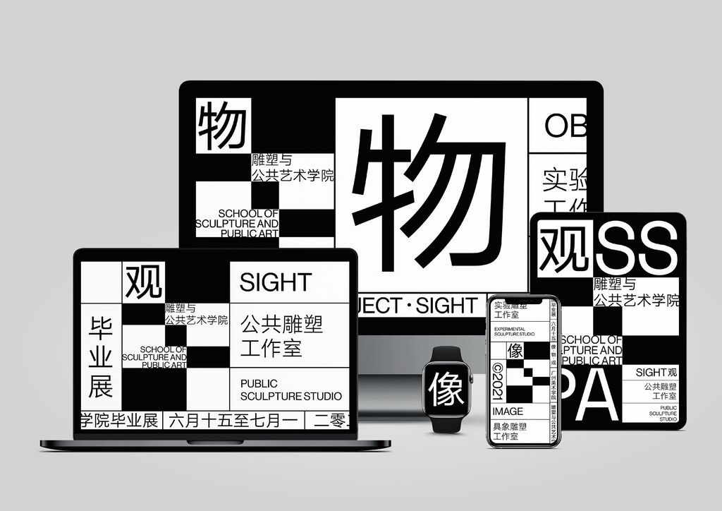 On the opening day of its 2021 Graduation Exhibition, this School of Sculpture and Public Art in China announced its new identity, which is based on the concept of pixels and grids. The core idea of the rebranding is to use as few decorative design elements as possible. The upper-left pixel of the logo serves as a space to place a “theme letter” to differentiate the individual studios. The S-signet becomes a layout grid for the exhibition information, in which Chinese characters and English letters are arranged symmetrically around a centre. The web design constantly changes by rotating the flat pixels to convey more information in one area.
