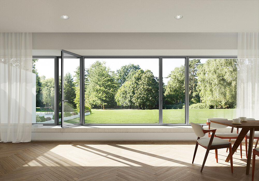 Ein minimalistisches Erscheinungsbild, das den Blick nicht vom Wesentlichen ablenkt, charakterisiert das Design des Schüco Fenstersystems AWS 75 PD.SI.