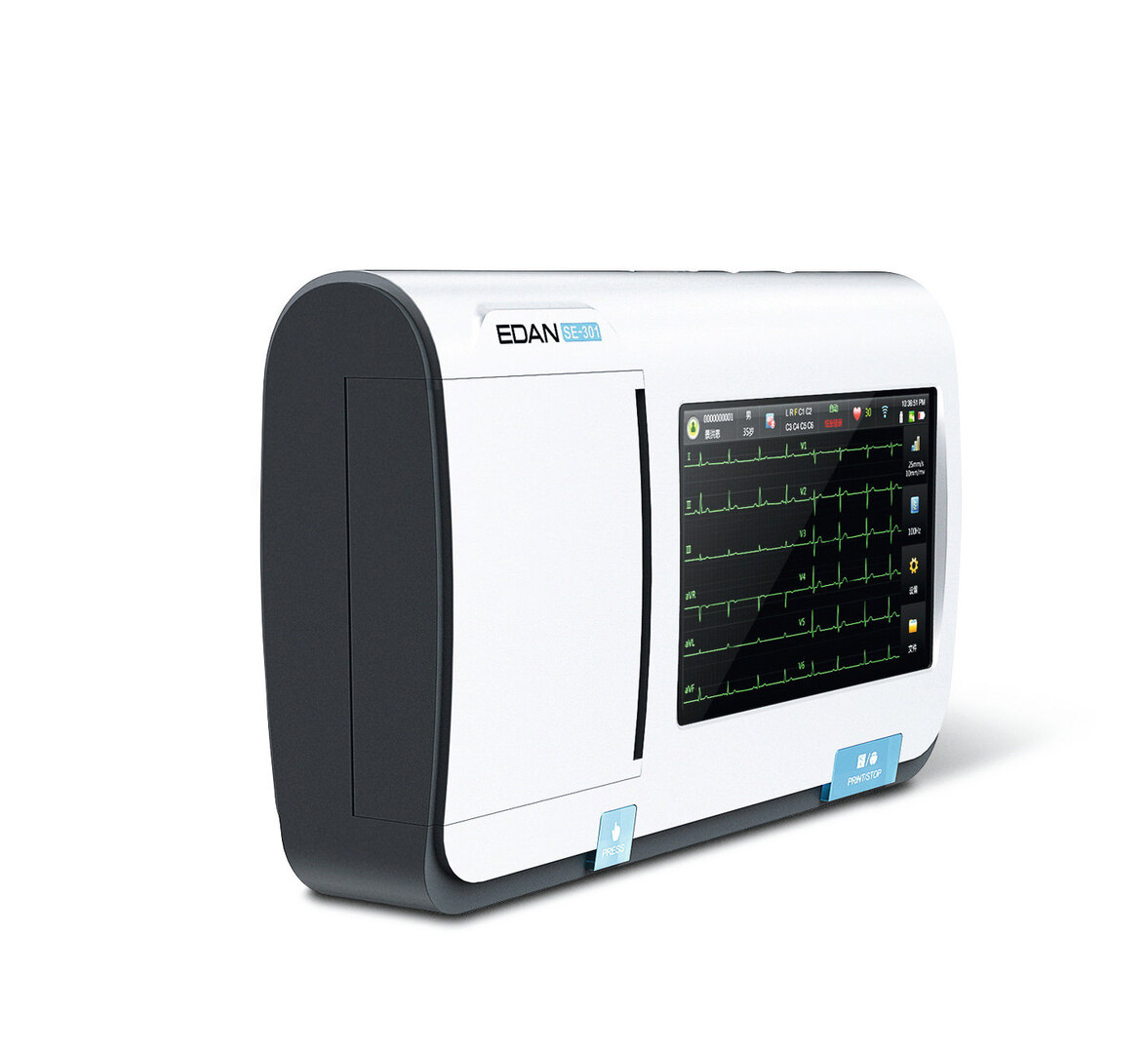 Das SE-301 ist ein mobil einsetzbares 3-Kanal-EKG-Gerät mit einem 5“ großen Farbtouchscreen und eingebautem Lithium-Ionen-Akku. Darüber hinaus ist das Gerät mit einem internen Thermodrucker ausgestattet und kann zwölf Messungen simultan aufnehmen. Über zwei USB-Anschlüsse sowie einen Micro-SD-Karten-Slot lassen sich verschiedene externe Geräte wie Speichermedien oder ein Barcodescanner anschließen. Die Patientendaten können mit einem Kabel oder optional via Wi-Fi übermittelt werden.