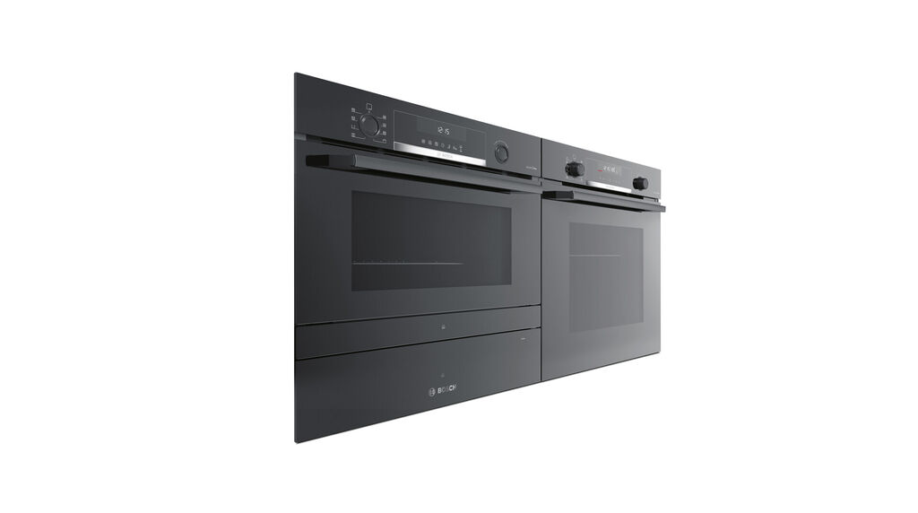 Der großflächige Einsatz von schwarzem Glas sorgt bei den Einbaubacköfen dieser Serie für ein puristisches Erscheinungsbild. Kontrastpunkte setzen allein das weiße LCD-Display sowie der Clip aus glänzendem Chrom, in den das Markenlogo eingeprägt ist. Dieser sogenannte Chrome-Clip ist Blickfang und strukturiert die Front, indem er das schmale Bedienfeld nach unten hin zur Ofentür abgrenzt.