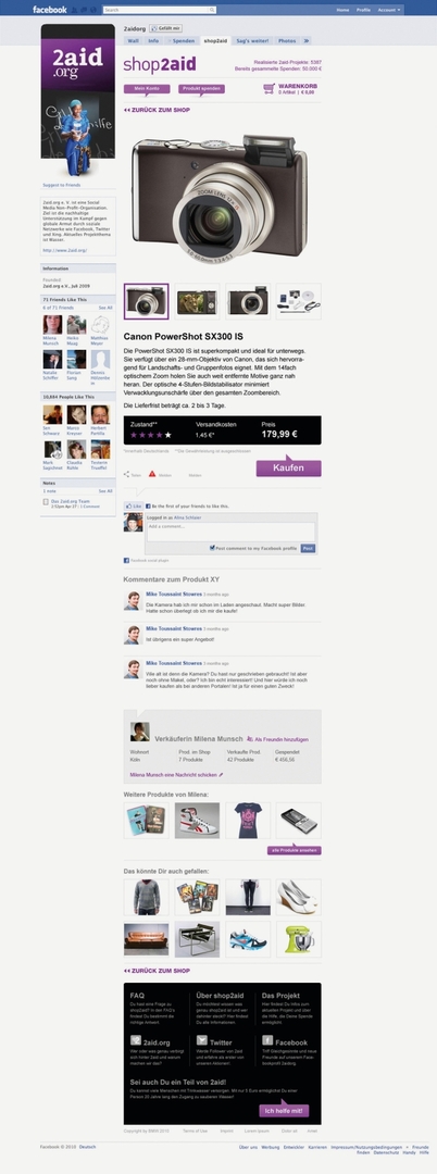 The non-profit organisation 2aid.org communicates its content exclusively via social network platforms like Facebook. This enables as many people as possible to be reached so as to win them over for charity projects. As the world’s first non-profit social media market place, the fundraising instrument shop2aid provides users with an opportunity to sell objects that are no longer needed, with proceeds going to charity. Facebook mechanisms are utilised so that product offers may be spread for free.
