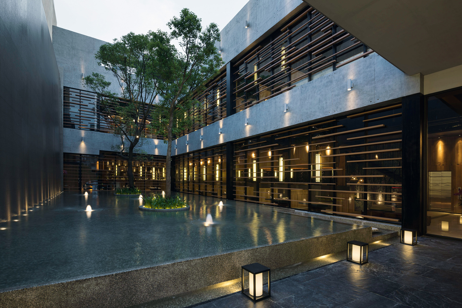 Adopting the appearance of a square, the architecture of the Shou Nichi Dou Yakiniku restaurant is characterised by a delicate, modern construction and a patio design surrounded by several buildings. In particular, the focus was placed on a lighting design that integrates solutions, such as five parallel columns of a splicing window. Well-balanced situational light is paired with a mix of indistinct shaking shadows and lights inside the building. Featuring the rustic flavour of old Japanese-style houses, an entirely black roof and details like strings of huge wooden barrels, the design aims to create visual tension.