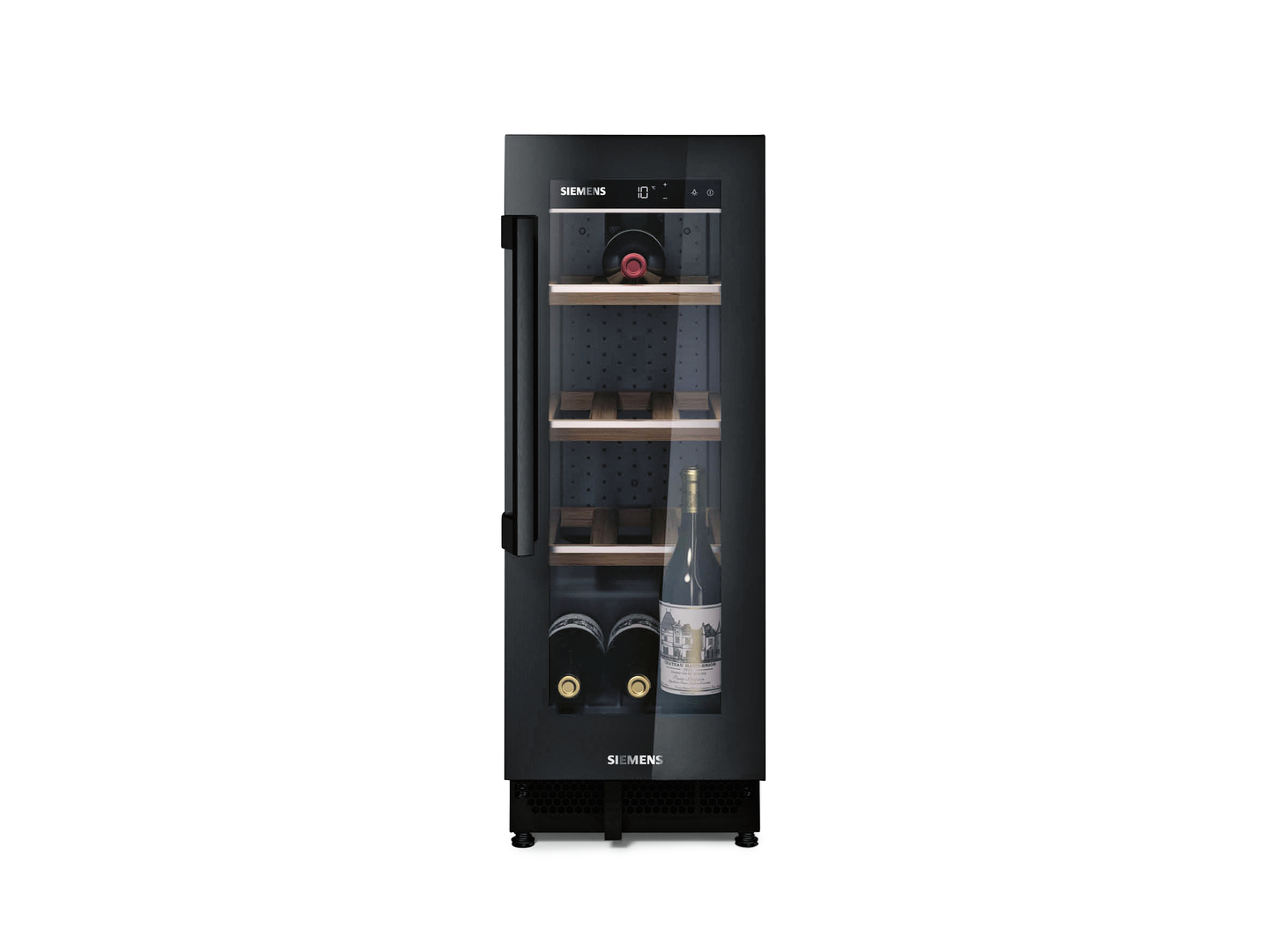 Eine hochwertige Ausstattung und eine zeitgemäße Funktionsweise zeichnen den Siemens Weinkühlschrank BU30 aus, der für Einbauküchen konzipiert wurde. Das 30 cm schlanke Gerät besitzt eine dunkle Oberfläche mit einem gefrästen, schwarz eloxierten Stangengriff aus Echtmetall. Das grafitgraue Interieur wird mit Eichenholz-Regalen kombiniert, die an der Stirnseite massive Aluminiumprofile haben. Für optimierte Lagerbedingungen sorgen ein getönter UV-Schutz der Tür sowie eine innovative Temperatursteuerung und -kontrolle mittels Touchbedienung.