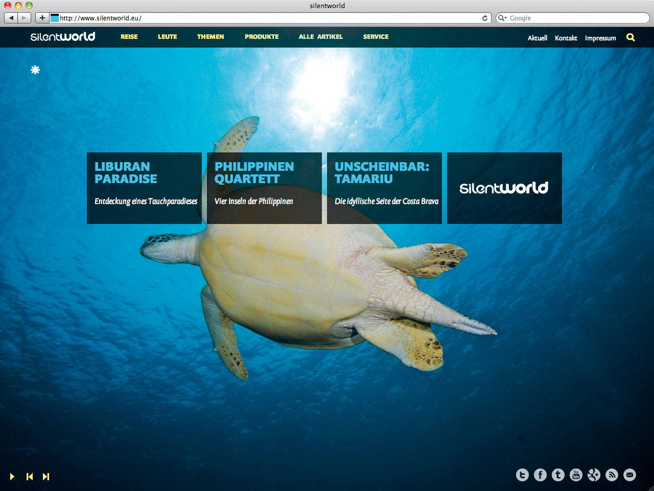 The relaunch of the web magazine “Silentworld” strives to make the beauty of the underwater world and the experience of diving come alive online. Expressive images by well-known photographers are combined with reports from the worlds above and below sea level: they tell of oceanic creatures, their visitors and their protectors. A map shows exciting diving sites and bases that divers may visit. Users are able to find and filter articles on this microsite using the menu categories “Leute” (People), “Themen” (Topics) or “Produkte” (Products).
