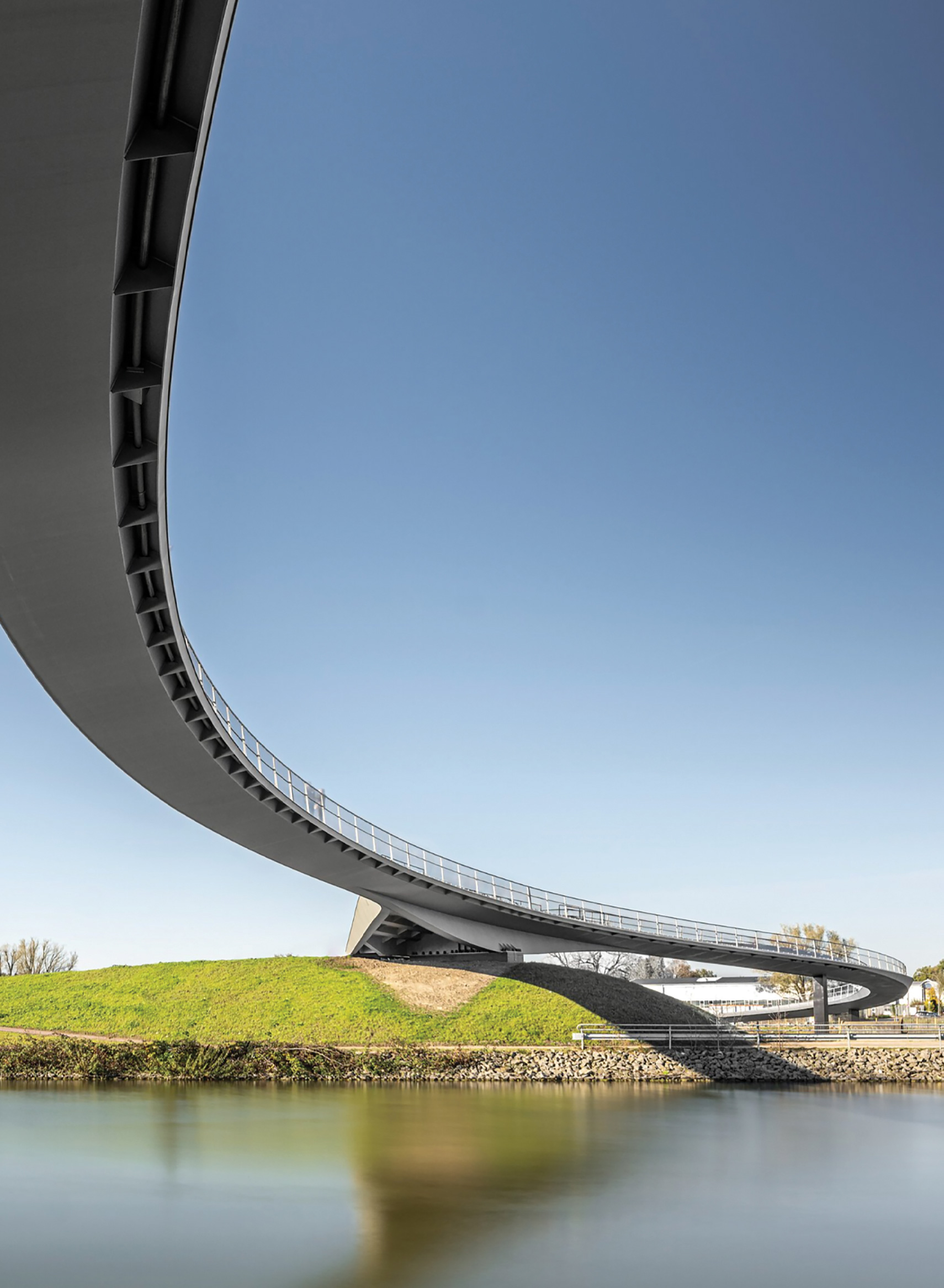 Silver Arrow is a new bridge that spans the River Emscher, key infrastructure, and the shipping route along the Rhein-Herne Canal. The bridge, which seamlessly blends structural logic, architecture, and cultural significance, is more than just infrastructure — it is also a space for community engagement with expansive views of the surrounding landscape. Silver Arrow represents the sociocultural transformation of this former industrial heartland. Bridge users and passers-by on the riverbanks pass through a three-dimensional structure that also functions as a viewing platform. The elegant form of the bridge is respectful of its context and becomes an integral part of the landscape that unlocks the potential of the surrounding parks. This modern bridge structure blends in seamlessly with its surroundings, drawing formal inspiration from the flowing terrain and the convergence of river, floodplain, and canal. The striking silhouette of the bridge reveals structural logic and flow, culminating in a sculptural peak highlighted by a central pylon above the deck. Its graceful profile reflects both the flow of forces and the deck's torsional performance, which is achieved using an in-height varying torsion box. Red Dot Award: Design Concept | Ready For Market | Architecture