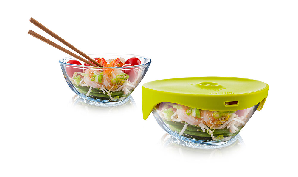 Dieser Single-Dampfgarer erleichtert den modernen Lebensstil und ermöglicht die schnelle Zubereitung einzelner Portionen in der Mikrowelle. Es lassen sich darin Gemüse, Fleisch, Fisch und Geflügel individuell zusammenstellen, dünsten und servieren. Die Schüssel aus stabilem Borosilikatglas wird mit einem Silikondeckel verschlossen, in welchem ein Ventil integriert ist. Der Deckel ermöglicht ein sicheres Abgießen von Wasser bzw. Kondensat. Dank ihrer dreieckigen Form passen mehrere Dampfgarer gleichzeitig in die Mikrowelle.