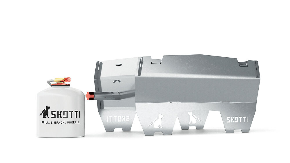 Der Gasgrill Skotti ist nicht nur tragbar, sondern auch zerlegbar und bei Outdoor-Aktivitäten im Wald, am Strand oder auf Touren mit Rad oder Motorrad ein origineller Begleiter. Er wiegt samt Transporttasche nur knapp 3 kg, passt flach in jeden Wanderrucksack und ist in wenigen Augenblicken ohne Werkzeug zusammengesteckt. Mit minimalem Aufwand lässt sich eine gegrillte Mahlzeit genießen, wobei beim Grillen stets Sicherheit gewährleistet ist. Die acht Teile des Geräts sind aus hochwertigem Edelstahl gefertigt und einfach zu reinigen.