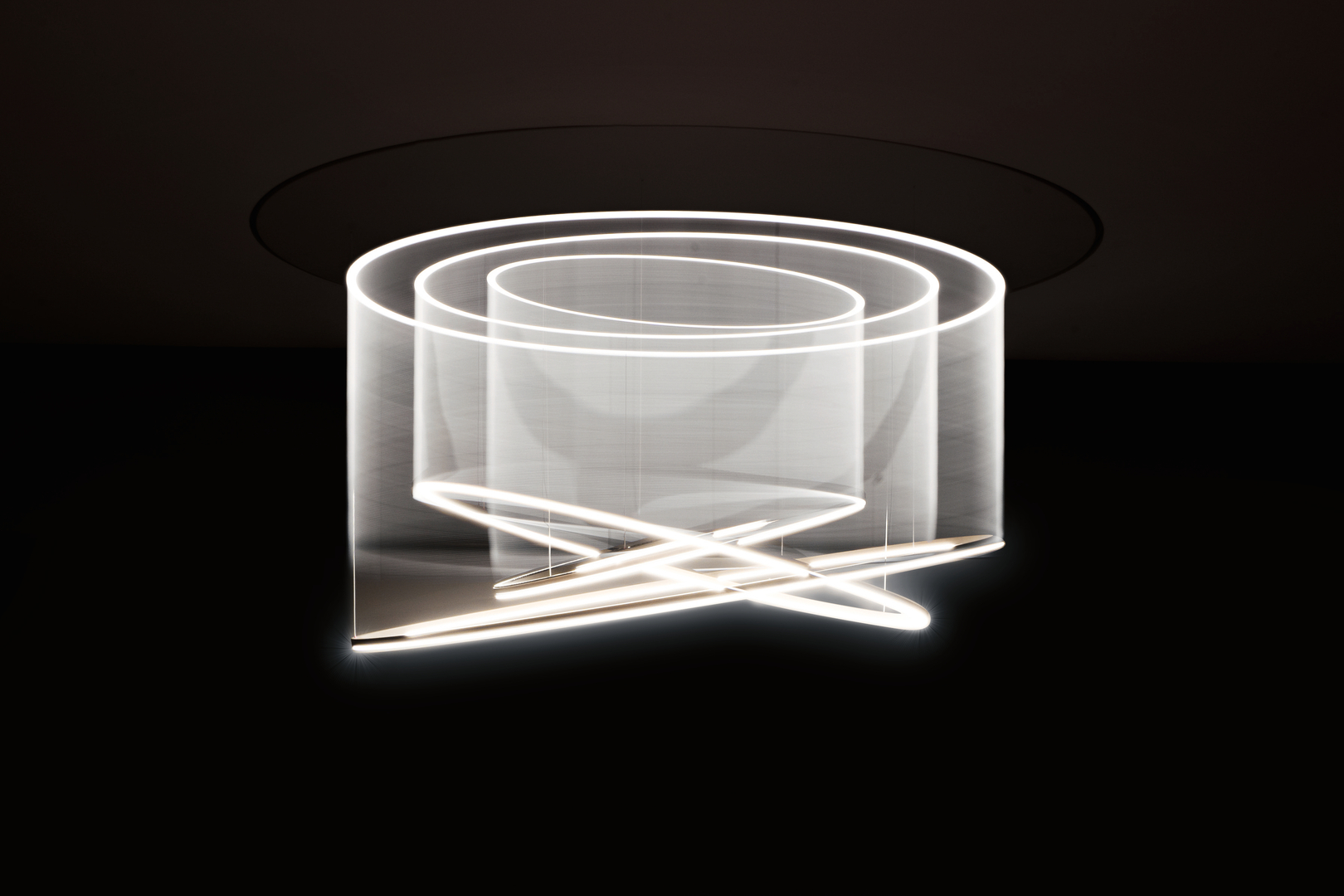 Die drei Ringe dieser auffallenden Pendelleuchte lassen sich in Höhe und Neigungswinkel flexibel ausrichten. Per App-Steuerung kann Slim in Motion luftig auf einer Ebene, raumgreifend tiefhängend oder wie ein moderner Kronleuchter im Raum positioniert werden. Jede Ringleuchte hängt an drei filigranen Drahtseilen und ist dimmbar, wobei die Farbtemperatur von 2.700 bis 6.000 Kelvin variiert. Die Anzahl der Leuchten, deren Größe und Oberflächen sind frei konfigurierbar. Um das elegante Gesamtbild nicht zu stören, wird die Technikeinheit unsichtbar in der Decke verbaut.