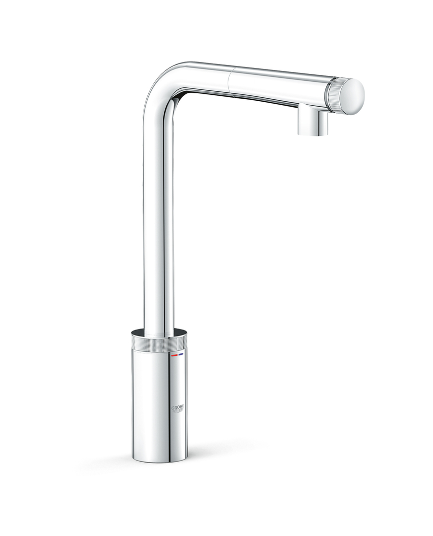 Bei dieser Küchenarmatur sorgt die Integration der neuen Ventiltechnologie „SmartControl“ für ein besonders puristisches Erscheinungsbild, da auf Bedienhebel komplett verzichtet werden konnte. Die Interaktion mit dem Wasser erfolgt stattdessen über ein Steuerventil, das so in die Armaturenfront eingelassen ist, dass die Kontrolle des Wasserflusses allein durch Drücken mit der Hand oder dem Unterarm möglich ist, was die Bedienung besonders hygienisch macht.