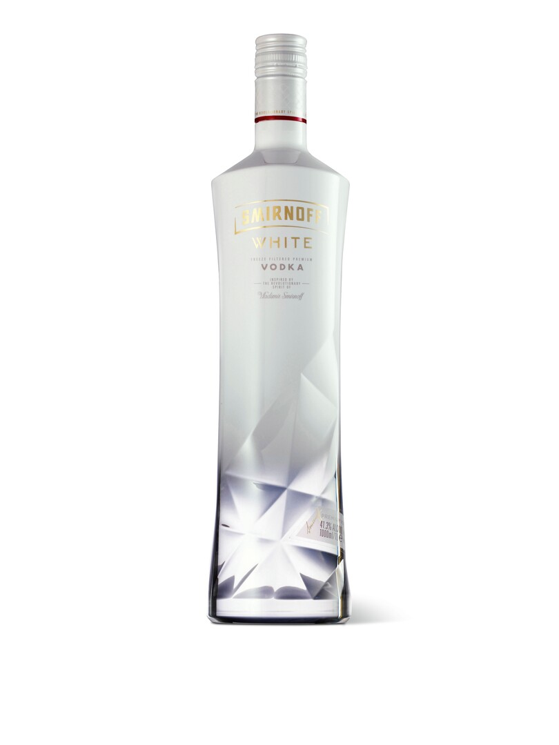 Smirnoff White is an exclusive new vodka, specifically designed for the global retail travel market. The packaging design was inspired by the brand’s glamorous past, which extends all the way back to Tsarist Russia. The marrying of glass with a white, porcelain-like finish conveys the impression of luxury. The bottle design incorporates a contemporary interpretation of historic extravagance and mirrors the striking facets of Baccarat crystal used in the Tsar’s court. The geometric shapes in the lower third of the bottle diffract light and thus are reminiscent of shards of arctic ice.