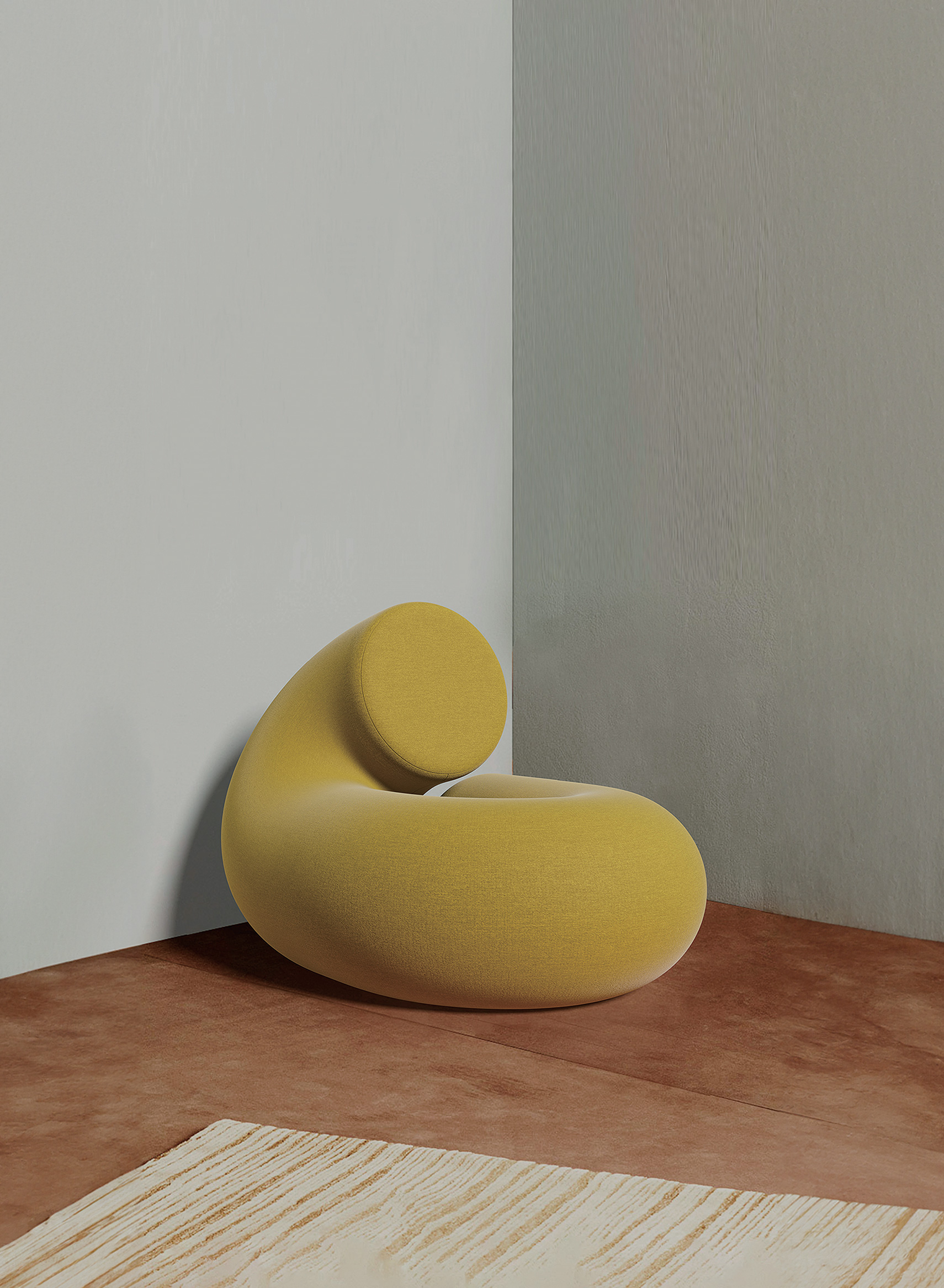 The SNAKE CHAIR, inspired by a snake’s sinuous shape, blends modern minimalism with a soft and intriguing appearance. The curved body provides an armrest or backrest, supported by a metal skeleton and foam padding for comfort. Sized to fit most spaces, its wide range of available fabrics makes it a functional and visual addition to any room. Red Dot Award: Design Concept | Ready For Market | Home and Seating Furniture