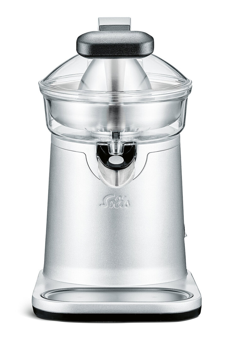 Die SOLIS Citrus Press Station ermöglicht das Pressen von Zitrusfrüchten jeder Größe. Dafür besitzt die Saftpresse einen automatisch rotierenden massiven Saftkegel aus schwerem Aluminium. Für mehr oder weniger Fruchtfleisch stehen zwei verschiedene Siebe aus hygienischem Edelstahl zur Verfügung, die wie alle abnehmbaren Teile spülmaschinenfest sind. Die Kunststoffteile wie der transparente Deckel und der ergonomisch gestaltete Griff sind BPA-frei.