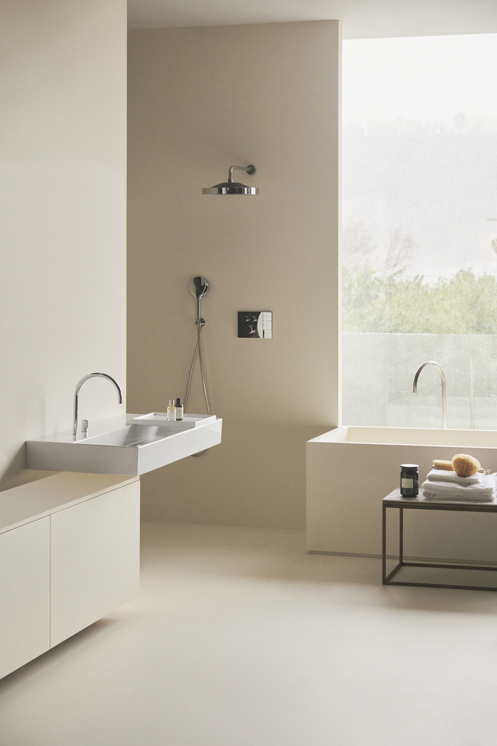 Solos umfasst neben einem Waschbecken mit integrierter Armatur auch eine Reihe Duschsysteme. Das Waschbecken ist aus dem Keramikmaterial Diamatec gefertigt, das komplexe Formgebungen ermöglicht und strapazierfähig ist. Dank der sequenziellen Mischtechnik der Armatur lassen sich mit einer einfachen Drehung des Bedienknopfes Temperatur und Durchfluss regeln. Auch eine berührungslose Variante mit Sensortechnik ist verfügbar. Das Duschsortiment wartet mit einer intelligenten Steuerung verschiedener Strahlarten sowie einer Beleuchtung mit Farbwechsel auf.