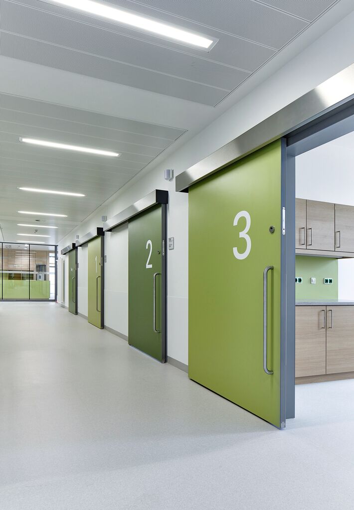 Das barrierefreie Schiebetürelement SONOR-SLIDE, bestehend aus Zarge und Holztürblatt, ist ein hochwertiges Türelement, mit dem sich große Durchgänge ebenso platzsparend wie ansprechend umsetzen lassen. Vom einfachen manuellen Schiebetürelement bis zur hygienischen, strahlengeschützten OP-Tür mit Automatikantrieb, Brand-, Rauch- und Schallschutz bietet das System den passenden Rahmen für unterschiedlichste Anwendungsfälle und vereint Ästhetik mit intelligenter Technik. Das Türblatt schließt bündig mit dem Zargenspiegel ab und benötigt keinen Einlaufpfosten. Für maximale Durchgangsbreiten kann die Tür beim Öffnen wandbündig zurückgefahren werden. Die klappbare Aluminiumblende verdeckt den leicht laufenden Schiebetürbeschlag.