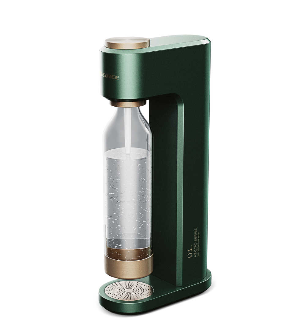 Der Sparkling Water Maker hat eine klare geometrische Gestaltung, die einen Fokus auf die Funktionalität des Produktes legt: die unkomplizierte Zubereitung von kohlensäurehaltigem Wasser. Der schlanke Korpus aus Kunststoff ist in einem ansprechenden Grün gehalten, von dem sich einzelne Elemente aus Aluminium stilvoll absetzen. Das Produkt überrascht mit einer integrierten Zubehörbox. Darin befindet sich eine tragbare Komponente, die es auch unterwegs ermöglicht, sprudelndes Wasser herzustellen.