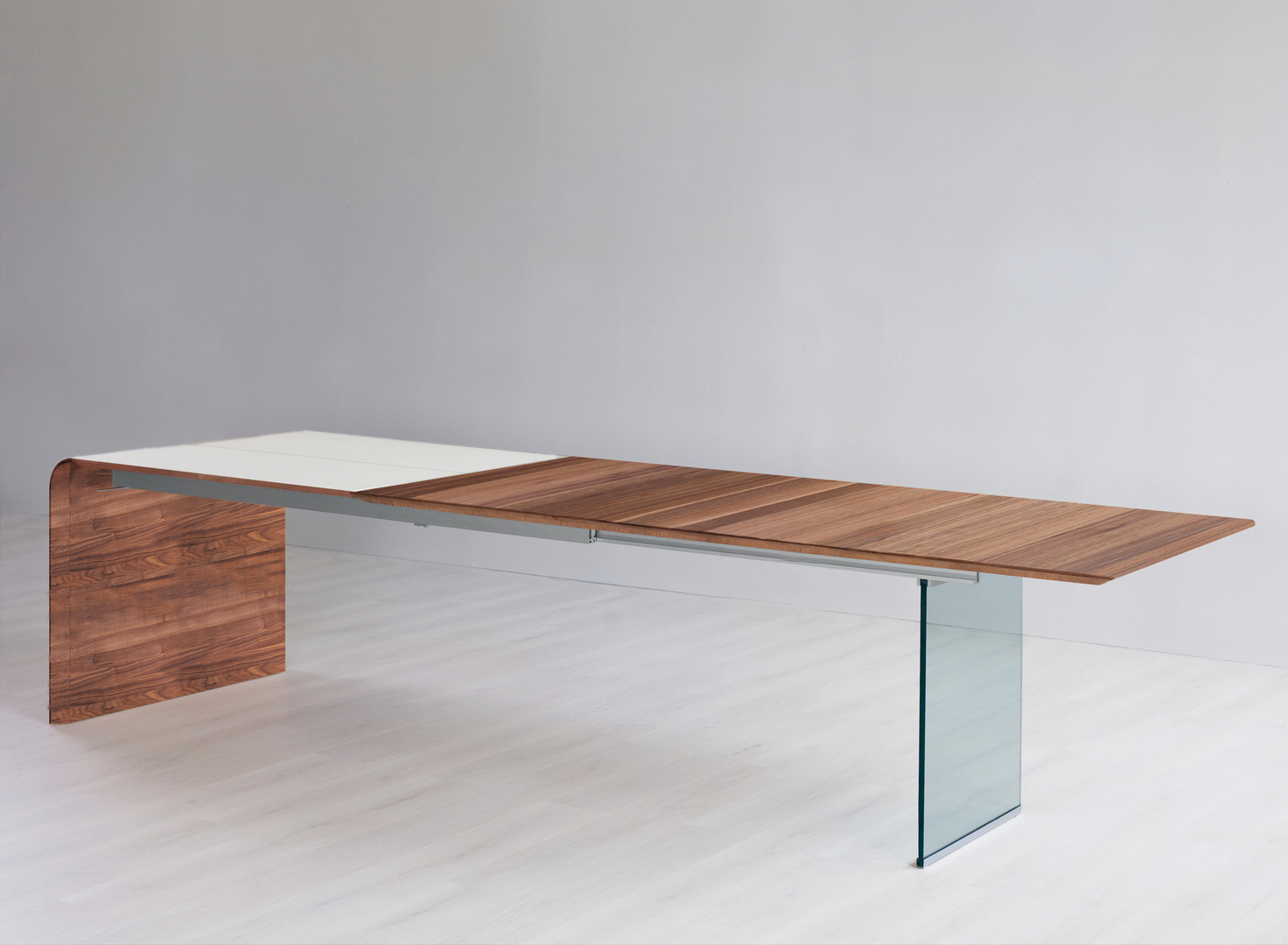 Spirit 1 ist ein Auszugstisch, der eine stimmungsvolle, architektonische Tischkultur verkörpert. Besonders seine außergewöhnliche Linienführung vermittelt einen Eindruck von Leichtigkeit und sorgt gleichermaßen für eine innovative Raumgliederung. In einem fließenden Übergang wird die aus Massivholz gestaltete Tischplatte zur Tischwange. Dieser gegenüber befindet sich eine aus Reinglas gefertigte Stützwange, welche einen auffälligen Kontrast setzt und dem Holzteil eine schwebende Optik verleiht. Das der Erweiterung des Tisches dienende Ausziehteil der Tischplatte wiederum besteht aus reinweißem Satinato-Glas, das für einen weiteren Kontrast und einen interessanten Materialmix sorgt. Spirit 1 lässt sich mit passenden Beimöbeln ergänzen, die den Tisch zu einem vielseitigen, hohen Ansprüchen genügenden Speisenprogramm machen.